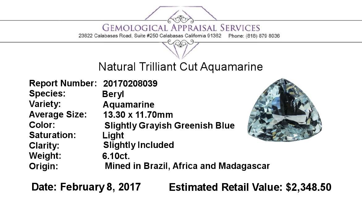 One natural trilliant cut aquamarine with an exact weight of 6.10 ct., clarity is slightly included, slightly grayish greenish blue, light. Gemological Appraisals Services estimates the retail value at $2348.5 GAS Appraised.