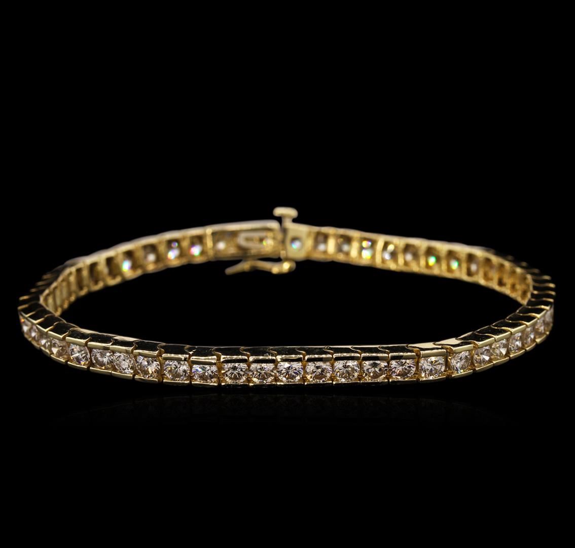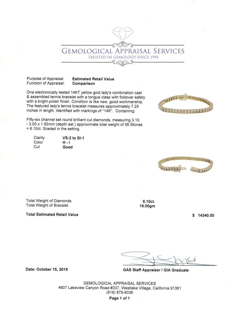 One electronically tested 14KT yellow gold lady's combination cast & assembled tennis bracelet with a tongue clasp with foldover safety with a bright polish finish. The featured lady's tennis bracelet measures approximately 7.25 inches in length. Identified with markings of "14K". Condition is like new, good workmanship. Containing: Fifty-Six channel set round brilliant cut diamonds, measuring 3.10 - 3.00 x 1.92mm (depth est.) approximate total weight of 56 Stones = 6.10ct. Graded in the setting. Clarity: VS-2 to SI-1. Color: H - I. Cut Good. Total Weight of Diamonds 6.10ct. Total Weight of Bracelet 16.00gm. GAS Appraised at $14,340.00.