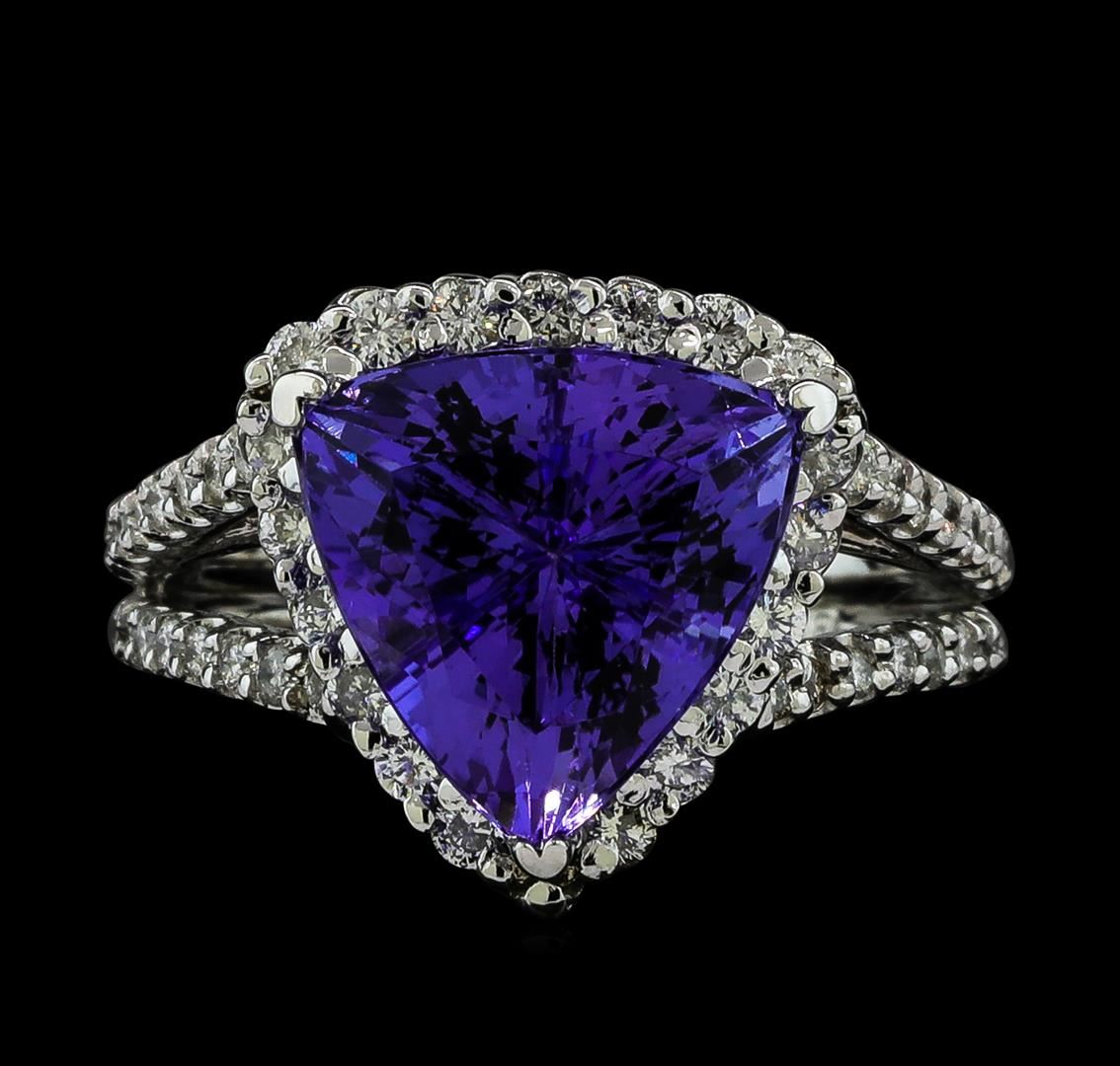 One electronically tested 14KT white gold lady's cast fashion ring with a split shank halo with a bright polish finish. The featured lady's ring has a double shank measuring 2.80 millimeters wide. Identified with markings of '14K'. Condition is new, good workmanship. Containing: One prong set triangle modified brilliant cut natural tanzanite, measuring 11.20 x 11.30 x 8.15mm, (depth est.) approximate weight of 6.10ct., clarity is eye clean, medium, moderately strong, violet color, (GIA V 5/4), cut is very good. Transmitting light with no distortion, transparent. Colored gemstones are presumed to have been subjected to commonly used enhancement processes. Graded in the setting. Twenty prong set round brilliant cut diamonds, measuring 1.75 - 1.65 x 1.05mm (depth est.) approximate total weight of 20 Stones = 0.37ct. Graded in the setting. Clarity SI-1 to I-1. Color: H - I Cut Good Thirty-Six prong set round brilliant cut diamonds, measuring 1.45 - 1.35 x 0.87mm (depth est.) approximate total weight of 36 Stones = 0.37ct. Graded in the setting. Clarity SI-1 to I-1. Color: H - I Cut Good. Total Weight of Colored Stones 6.10ct.. Total Weight of Diamonds 0.74ct.. Total Weight of Ring 6.00gm. GAS Appraised at $11,980.00.