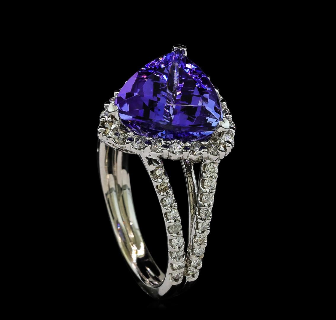 One electronically tested 14KT white gold lady's cast fashion ring with a split shank halo with a bright polish finish. The featured lady's ring has a double shank measuring 2.80 millimeters wide. Identified with markings of '14K'. Condition is new, good workmanship. Containing: One prong set triangle modified brilliant cut natural tanzanite, measuring 11.20 x 11.30 x 8.15mm, (depth est.) approximate weight of 6.10ct., clarity is eye clean, medium, moderately strong, violet color, (GIA V 5/4), cut is very good. Transmitting light with no distortion, transparent. Colored gemstones are presumed to have been subjected to commonly used enhancement processes. Graded in the setting. Twenty prong set round brilliant cut diamonds, measuring 1.75 - 1.65 x 1.05mm (depth est.) approximate total weight of 20 Stones = 0.37ct. Graded in the setting. Clarity SI-1 to I-1. Color: H - I Cut Good Thirty-Six prong set round brilliant cut diamonds, measuring 1.45 - 1.35 x 0.87mm (depth est.) approximate total weight of 36 Stones = 0.37ct. Graded in the setting. Clarity SI-1 to I-1. Color: H - I Cut Good. Total Weight of Colored Stones 6.10ct.. Total Weight of Diamonds 0.74ct.. Total Weight of Ring 6.00gm. GAS Appraised at $11,980.00.