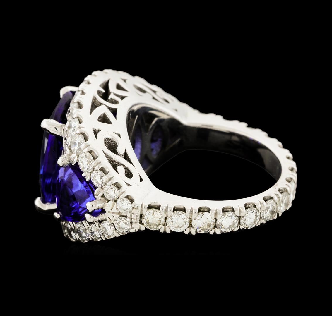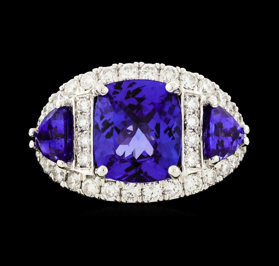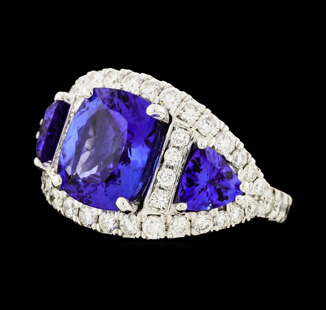 One electronically tested 14KT white gold lady's cast 3-stone halo ring with a diamond eternity shank with a bright polish finish. The featured lady's ring has a shank measuring 2.80 millimeters wide. Identified with markings of '14K'. Condition is new, good workmanship. Containing: One prong set rectangular cushion modified brilliant cut natural tanzanite, measuring 10.83 x 9.33 x 5.60mm, (depth est.) approximate weight of 4.43ct., clarity is eye clean, dark, strong, violetish blue color, (GIA vB 7/5), cut is very good. Transmitting light with no distortion, transparent. Colored gemstones are presumed to have been subjected to commonly used enhancement processes. Graded in the setting. Two prong set triangle modified brilliant cut natural tanzanites, measuring 6.40 x 6.30 x 3.47mm, (depth est.) approximate total weight of 1.67ct., clarity is eye clean, dark, strong, violetish blue color, (GIA vB 7/5), cut is very good. Transmitting light with no distortion, transparent. Colored gemstones are presumed to have been subjected to commonly used enhancement processes. Graded in the setting. Thirty-Seven prong set round brilliant cut diamonds, measuring 2.40 - 2.30 x 1.46mm (depth est.) approximate total weight of 37 Stones = 2.00ct. Graded in the setting. Clarity SI-1 to SI-2. Color: H - I Cut Good Twenty prong set round brilliant cut diamonds, measuring 2.00 - 1.90 x 1.21mm (depth est.) approximate total weight of 20 Stones = 0.56ct. Graded in the setting. Clarity SI-1 to SI-2. Color: H - I Cut Good. Total Weight of Colored Stones 6.10ct.. Total Weight of Diamonds 2.56ct.. Total Weight of Ring 10.70gm. GAS Appraised at $17,725.00.