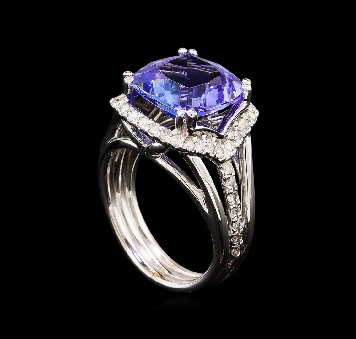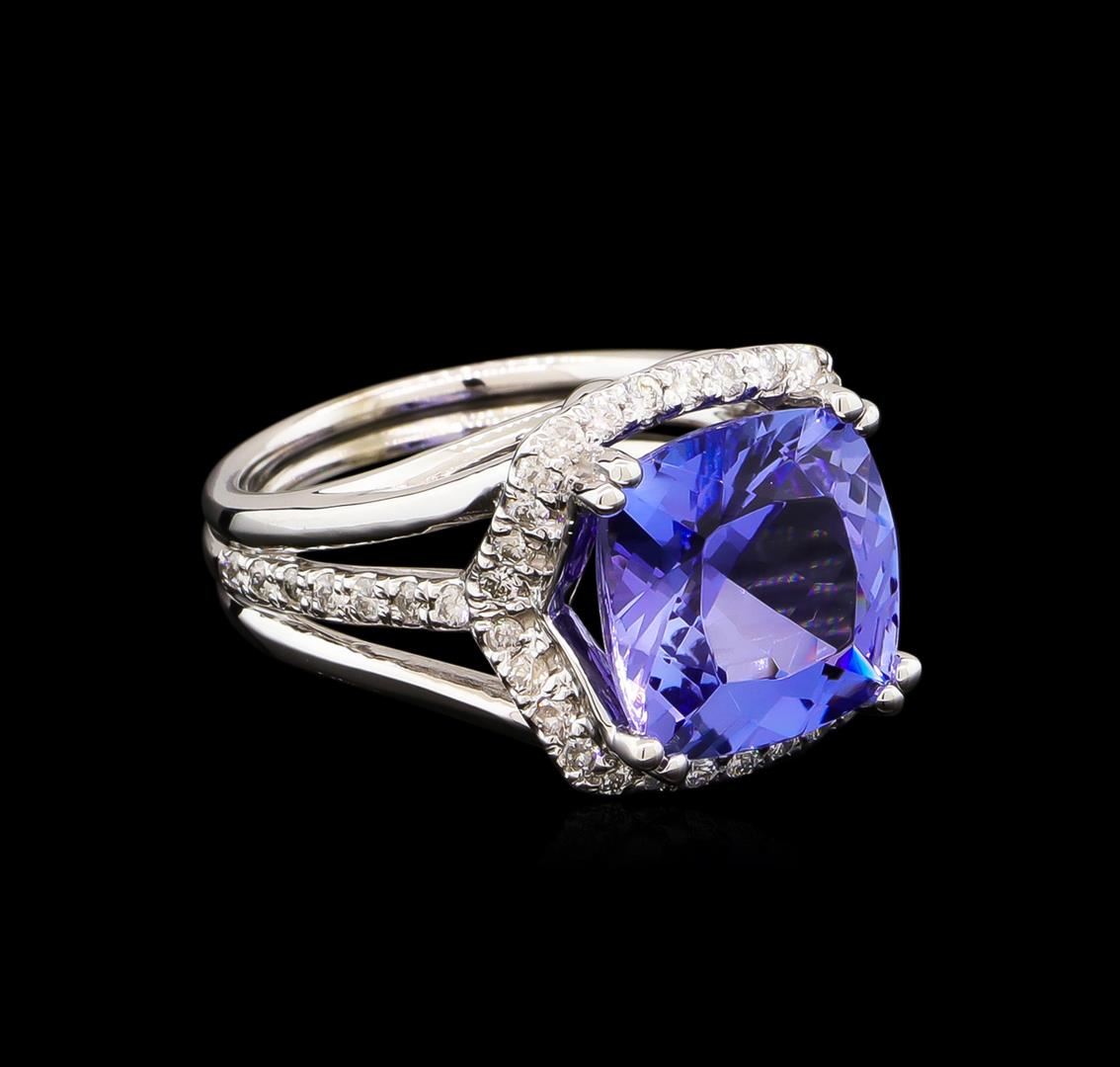 One electronically tested 14KT white gold lady's cast fashion ring with a three row split shank halo with a bright polish finish. The featured lady's ring has a triple shank measuring 4.50 millimeters wide. Identified with markings of "14K". Condition is new, good workmanship. Containing: One prong set square cushion modified brilliant cut natural tanzanite, measuring 11.15 x 11.11 x 6.74mm, approximate weight of 6.11ct., clarity is eye clean, type I, medium, moderately strong, bluish violet color, (GIA bV 5/4), cut is very good. Transmitting light with no distortion, transparent. Colored gemstones are presumed to have been subjected to commonly used enhancement processes. Graded in the setting. Forty-Five prong set round brilliant cut diamonds, measuring 1.50 - 1.40 x 0.88mm (depth est.) approximate total weight of 45 Stones = 0.51ct. Graded in the setting. Clarity: SI-1 to I-1. Color: H - I. Cut Good. Total Weight of Colored Stones 6.11ct. Total Weight of Diamonds 0.51ct. Total Weight of Ring 9.00gm. GAS Appraised at $12,145.00.