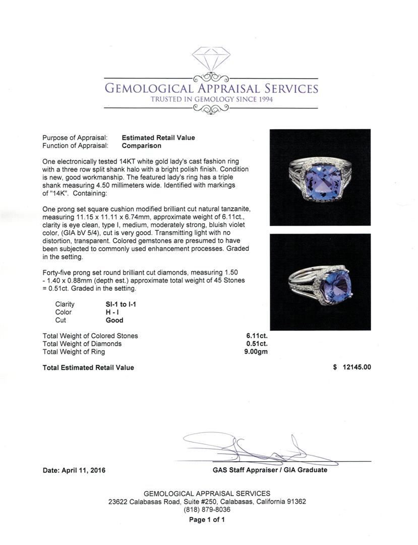 One electronically tested 14KT white gold lady's cast fashion ring with a three row split shank halo with a bright polish finish. The featured lady's ring has a triple shank measuring 4.50 millimeters wide. Identified with markings of "14K". Condition is new, good workmanship. Containing: One prong set square cushion modified brilliant cut natural tanzanite, measuring 11.15 x 11.11 x 6.74mm, approximate weight of 6.11ct., clarity is eye clean, type I, medium, moderately strong, bluish violet color, (GIA bV 5/4), cut is very good. Transmitting light with no distortion, transparent. Colored gemstones are presumed to have been subjected to commonly used enhancement processes. Graded in the setting. Forty-Five prong set round brilliant cut diamonds, measuring 1.50 - 1.40 x 0.88mm (depth est.) approximate total weight of 45 Stones = 0.51ct. Graded in the setting. Clarity: SI-1 to I-1. Color: H - I. Cut Good. Total Weight of Colored Stones 6.11ct. Total Weight of Diamonds 0.51ct. Total Weight of Ring 9.00gm. GAS Appraised at $12,145.00.