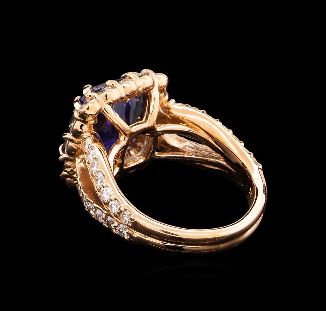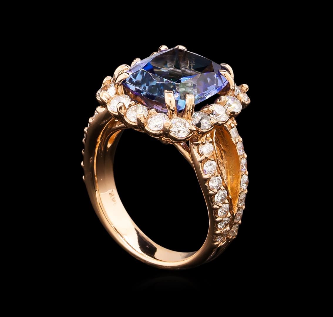 One electronically tested 14KT rose gold lady's cast fashion ring with a split shank halo with a bright polish finish. The featured lady's ring has a double shank measuring 3.77 millimeters wide. Identified with markings of "14K". Condition is new, good workmanship. Containing: One prong set rectangular cushion modified brilliant cut natural tanzanite, measuring 11.68 x 10.06 x 6.51mm, approximate weight of 6.12ct., clarity is eye clean, type I, medium dark, slightly grayish, bluish violet color, (GIA bV 6/2), cut is very good. Transmitting light with no distortion, transparent. Colored gemstones are presumed to have been subjected to commonly used enhancement processes. Graded in the setting. Sixteen prong set round brilliant cut diamonds, measuring 2.60 - 2.50 x 1.58mm (depth est.) approximate total weight of 16 Stones = 1.00ct. Graded in the setting. Clarity: SI-1 to I-1. Color: H - I. Cut Good Twenty-Eight prong set round brilliant cut diamonds, measuring 1.90 - 1.80 x 1.15mm (depth est.) approximate total weight of 28 Stones = 0.68ct. Graded in the setting. Clarity: SI-1 to I-1. Color: H - I. Cut Good. Total Weight of Colored Stones 6.12ct. Total Weight of Diamonds 1.68ct. Total Weight of Ring 9.60gm. GAS Appraised at $13,120.00.