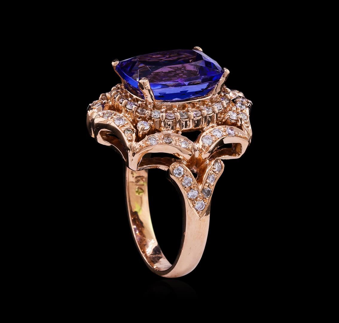 One electronically tested 14KT rose gold lady's cast fashion ring with a split shank with a bright polish finish. The featured lady's ring has a shank measuring 2.76 millimeters wide. Identified with markings of "K14". Condition is new, good workmanship. Containing: One prong set rectangular cushion modified brilliant cut natural tanzanite, measuring 12.00 x 8.98 x 6.50mm, 10%. bulge factor, approximate weight of 6.12ct., clarity is eye clean, type I, medium dark, moderately strong, violetish blue color, (GIA vB 6/4), cut is very good. Transmitting light with no distortion, transparent. Colored gemstones are presumed to have been subjected to commonly used enhancement processes. Graded in the setting. Sixty-Six prong set round brilliant cut diamonds, measuring 1.50 - 1.40 x 0.90mm (depth est.) approximate total weight of 66 Stones = 0.75ct. Graded in the setting. Clarity: SI-1 to I-1. Color: H - I. Cut Good. Total Weight of Colored Stones 6.12ct. Total Weight of Diamonds 0.75ct. Total Weight of Ring 10.10gm. GAS Appraised at $13,930.00.
