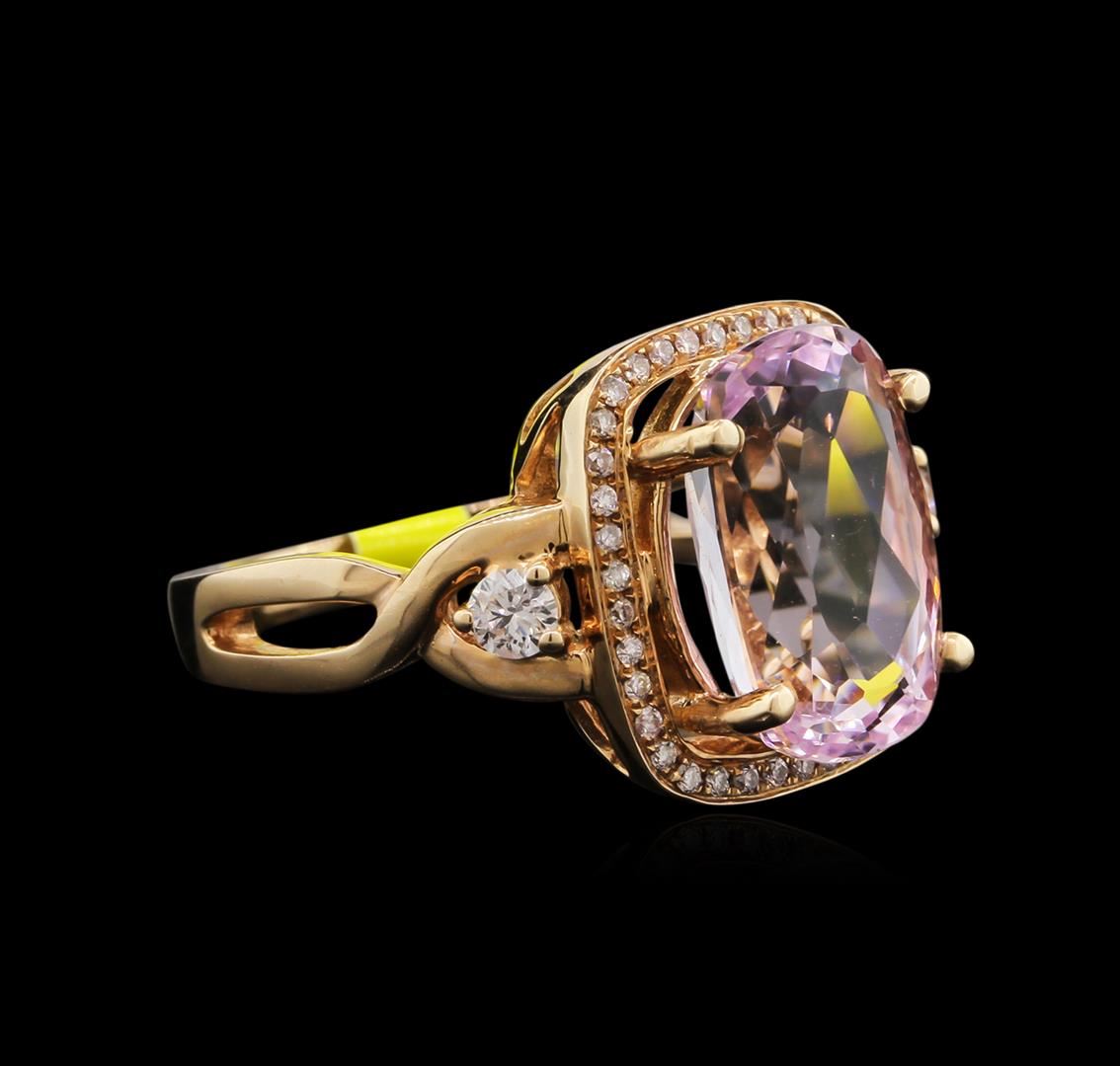 One electronically tested 14KT rose gold lady's cast fashion ring with a bright polish finish. The featured lady's ring has a halo motif and 2.4 millimeter wide shank. Identified with markings of "14K". Condition is new, good workmanship. Containing: One prong set rectangular cushion standard brilliant cut natural kunzite, measuring 13.50 x 8.30 x 6.50mm, 10%. bulge factor, approximate weight of 6.13ct., clarity is eye clean, type I, light, reddish purple color, (GIA rP 3/0), cut is very good. Colored gemstones are presumed to have been subjected to commonly used enhancement processes. Two prong set round brilliant cut diamonds, measuring 2.90 - 2.75 x 1.70mm (depth est.) approximate. Total Weight of 2 Stones = 0.18ct. Graded in the setting. Clarity: SI-1 to SI-2. Color: G - Good Thirty-Eight bead set round brilliant cut diamonds, measuring 1.15 - 1.00 x 0.70mm (depth est.) approximate. Total Weight of 38 Stones = 0.20ct. Graded in the setting. Clarity: SI-1 to SI-2. Color: H - I. Cut Good. Total Weight of Colored Stones 6.13ct. Total Weight of Diamonds 0.38ct. Total Weight of Ring 7.50gm. GAS Appraised at $5,685.00.
