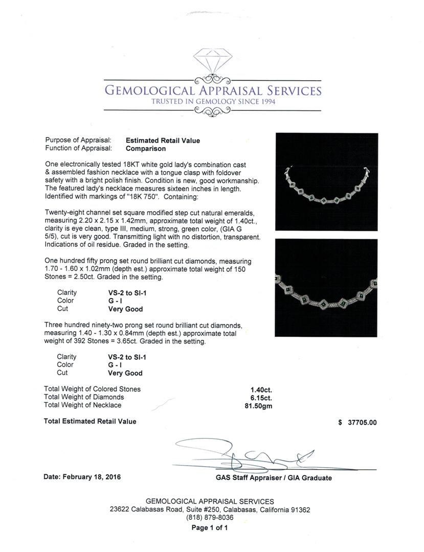 One electronically tested 18KT white gold lady's combination cast & assembled fashion necklace with a tongue clasp with foldover safety with a bright polish finish. The featured lady's necklace measures sixteen inches in length. Identified with markings of "18K 750". Condition is new, good workmanship. Containing: Twenty-eight channel set square modified step cut natural emeralds, measuring 2.20 x 2.15 x 1.42mm, approximate total weight of 1.40ct., clarity is eye clean, type III, medium, strong, green color, (GIA G 5/5), cut is very good. Transmitting light with no distortion, transparent. Indications of oil residue. Graded in the setting. One Hundred Fifty prong set round brilliant cut diamonds, measuring 1.70 - 1.60 x 1.02mm (depth est.) approximate total weight of 150 Stones = 2.50ct. Graded in the setting. Clarity: VS-2 to SI-1. Color: G - I. Cut Very Good Three Hundred Ninety-Two prong set round brilliant cut diamonds, measuring 1.40 - 1.30 x 0.84mm (depth est.) approximate total weight of 392 Stones = 3.65ct. Graded in the setting. Clarity: VS-2 to SI-1. Color: G - I. Cut Very Good. Total Weight of Colored Stones 1.40ct. Total Weight of Diamonds 6.15ct. Total Weight of Necklace 81.50gm. GAS Appraised at $37,705.00.