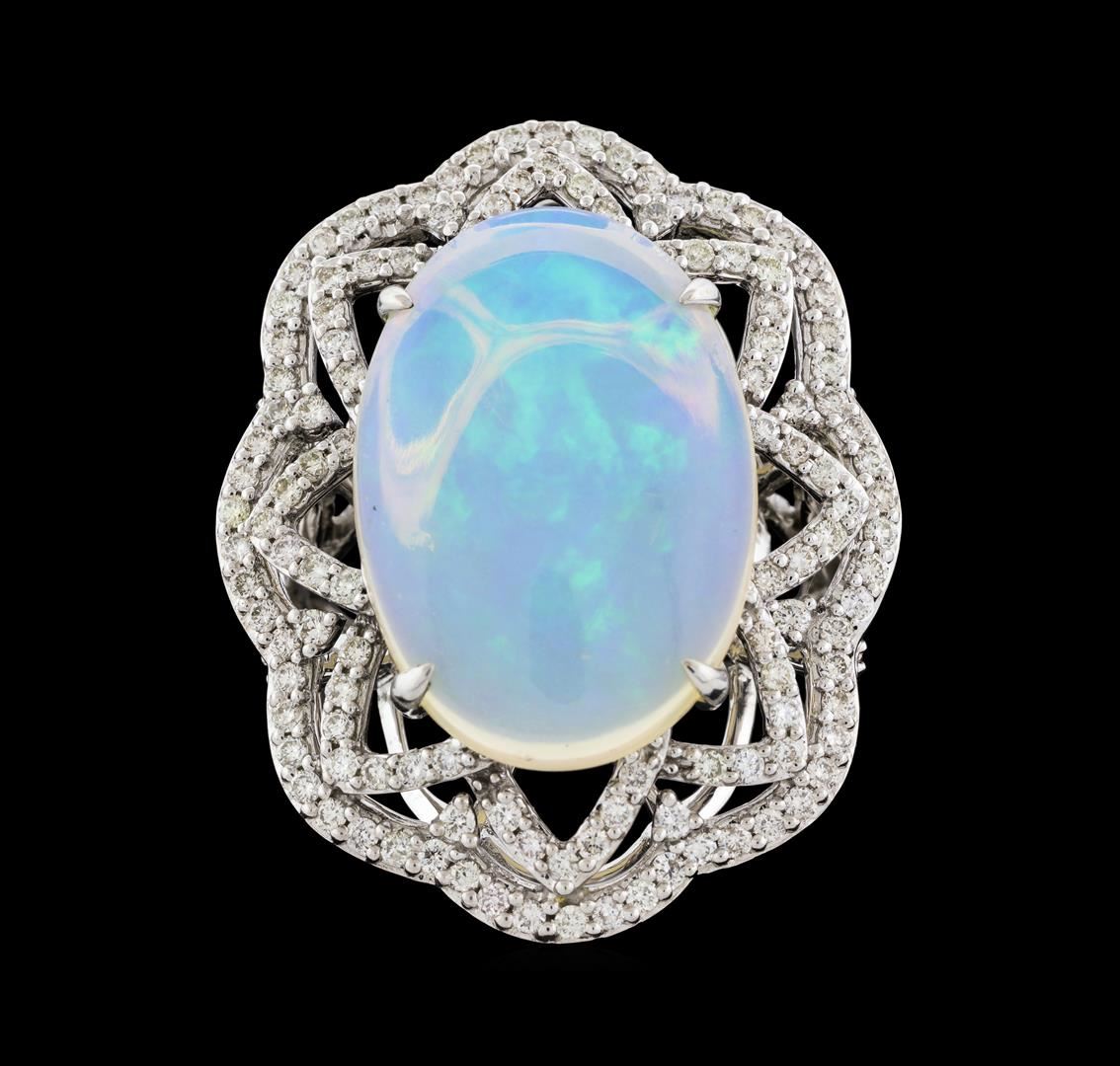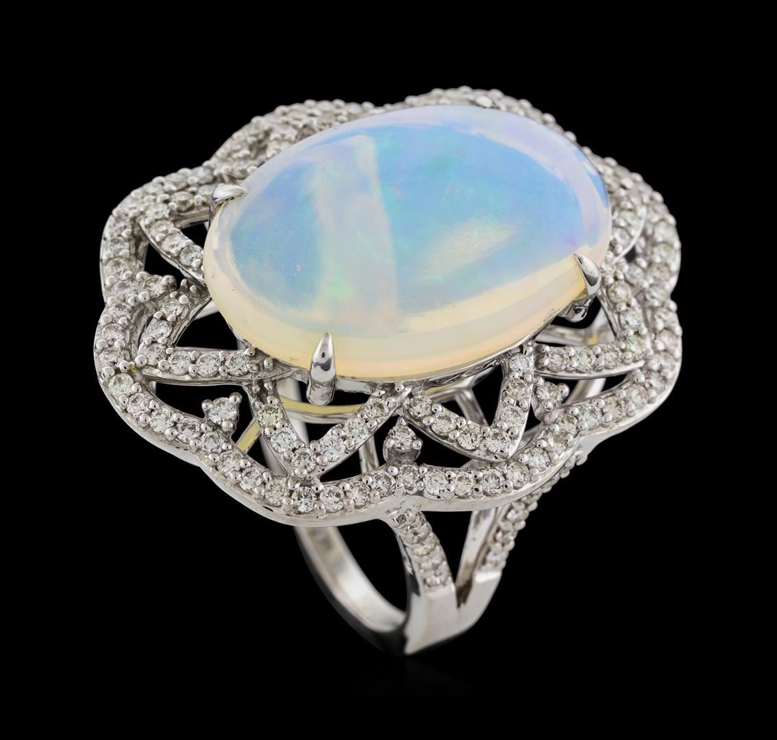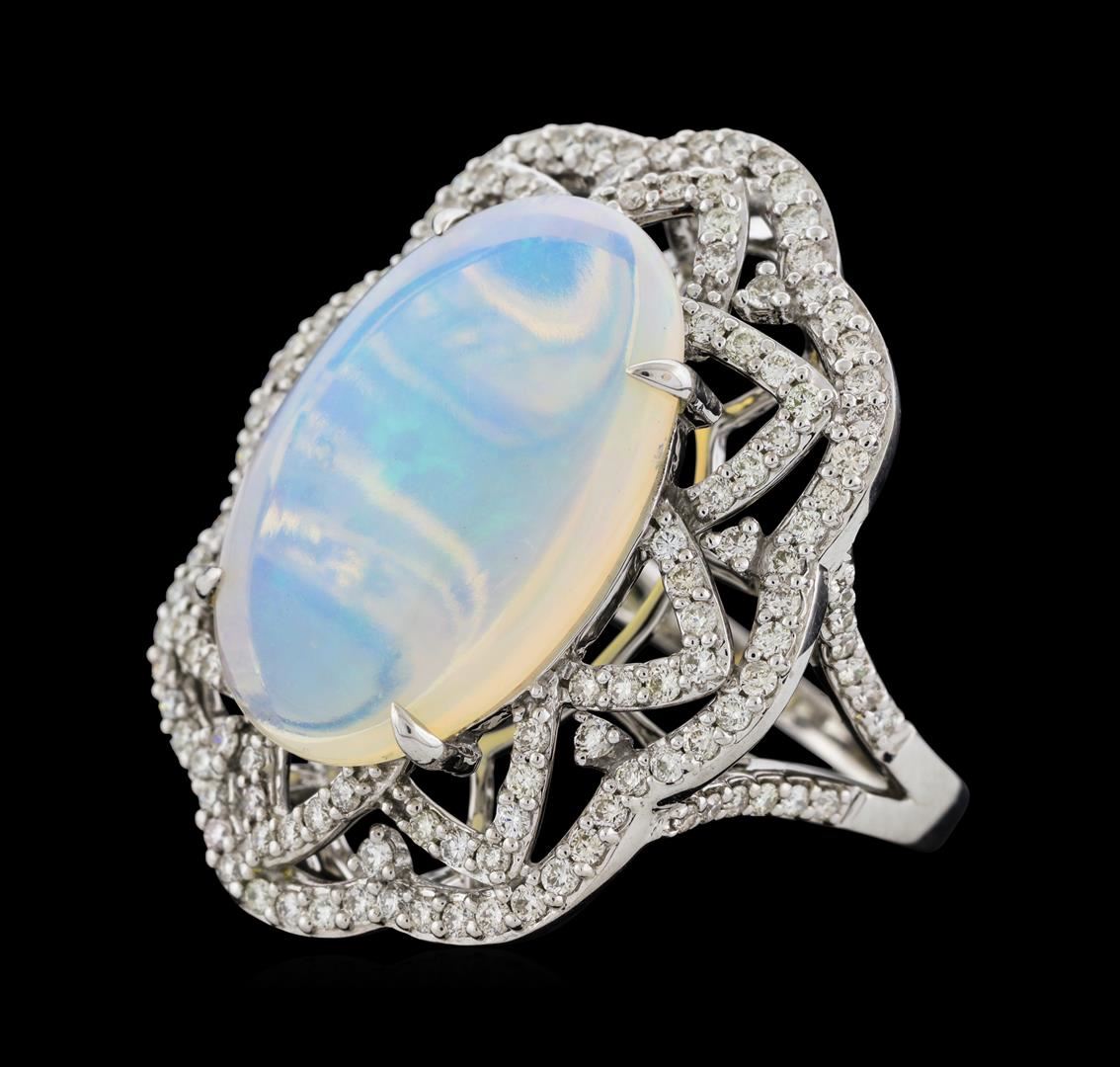 One electronically tested 14KT white gold lady's cast fashion ring with a split cathedral shank with a bright polish finish. The featured lady's ring has double scalloped basket halo and a shank measuring 1.75 millimeters wide. Identified with markings of '14K'. Condition is new, good workmanship. Containing: One crystal opal that is cut in a oval shaped cabochon and is prong set, measuring 20.00 mm long x 13.95 mm wide, and 5.04 mm thick and the approximate weight is 6.16 carats. The opal has a somewhat bright, blue-green play of color (fire) in a rolling flashfire pattern; a low dome; a good cut; no inclusions; consistent in its brightness and pattern; and is not directional. Graded in the setting. One Hundred Forty-Six prong set round brilliant cut diamonds, measuring 1.30 - 1.20 x 0.75mm (depth est.) approximate total weight of 146 Stones = 1.04ct. Graded in the setting. Clarity SI-1 to SI-2. Color: G - I Cut Good. Total Weight of Diamonds 1.04ct.. Total Weight of Opals 6.16ct.. Total Weight of Ring 10.00gm. GAS Appraised at $7,155.00.