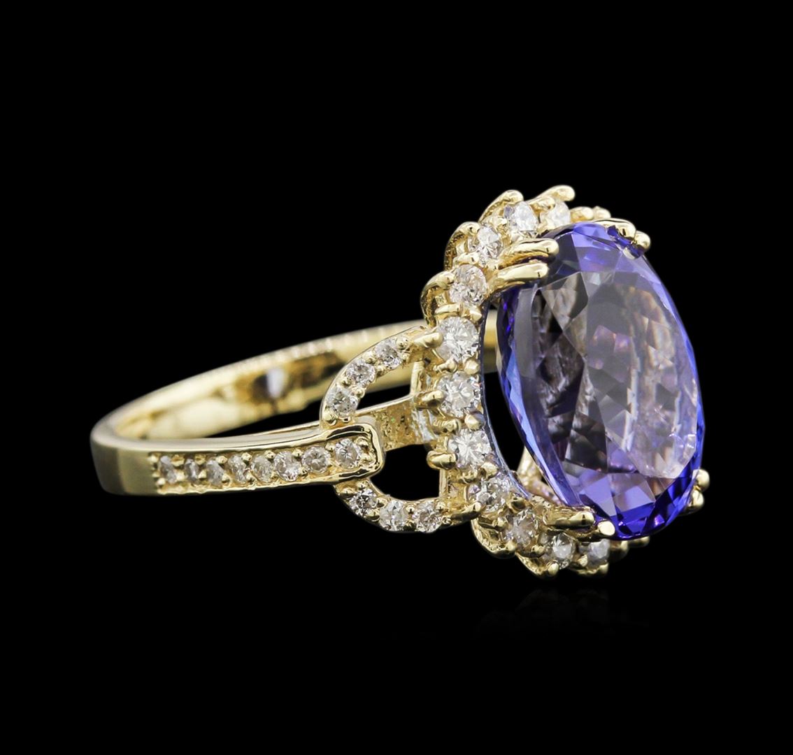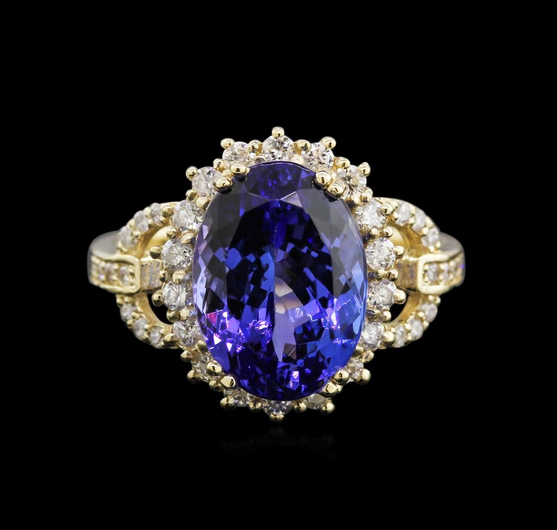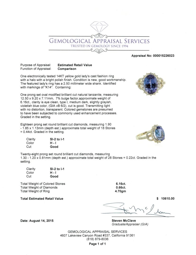 One electronically tested 14KT yellow gold lady's cast fashion ring with a halo with a bright polish finish. The featured lady's ring has a 2.50 millimeter wide shank. Identified with markings of "K14". Condition is new, good workmanship. Containing: One prong set oval modified brilliant cut natural tanzanite, measuring 12.50 x 9.20 x 7.11mm, 7% bulge factor, approximate weight of 6.16ct., clarity is eye clean, type I, medium dark, slightly grayish, violetish blue color, (GIA vB 6/2), cut is good. Transmitting light with no distortion, transparent. Colored gemstones are presumed to have been subjected to commonly used enhancement processes. Graded in the setting. Eighteen prong set round brilliant cut diamonds, measuring 1.90 - 1.85 x 1.13mm (depth est.) approximate total weight of 18 Stones = 0.44ct. Graded in the setting. Clarity: SI-2 to I-1. Color: H - I. Cut Good Twenty-Eight prong set round brilliant cut diamonds, measuring 1.30 - 1.20 x 0.81mm (depth est.) approximate total weight of 28 Stones = 0.22ct. Graded in the setting. Clarity: SI-2 to I-1. Color: H - I. Cut Good. Total Weight of Colored Stones 6.16ct. Total Weight of Diamonds 0.66ct. Total Weight of Ring 4.70gm. GAS Appraised at $10,610.00.