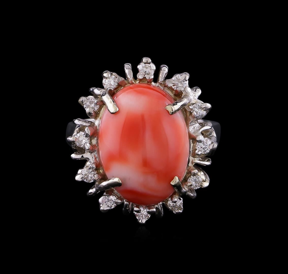 One ring featuring: 14KT white gold weighing 6.55 grams containing one coral center stone with a total weight of 6.18ct and diamonds with a total weight of 0.32ct.
