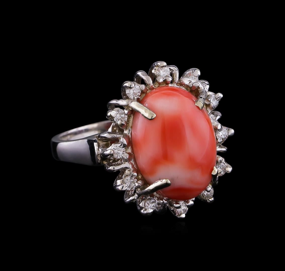 One ring featuring: 14KT white gold weighing 6.55 grams containing one coral center stone with a total weight of 6.18ct and diamonds with a total weight of 0.32ct.
