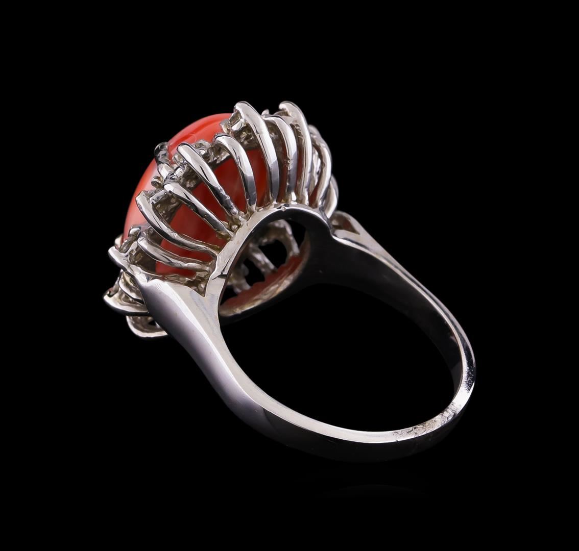 One ring featuring: 14KT white gold weighing 6.55 grams containing one coral center stone with a total weight of 6.18ct and diamonds with a total weight of 0.32ct.