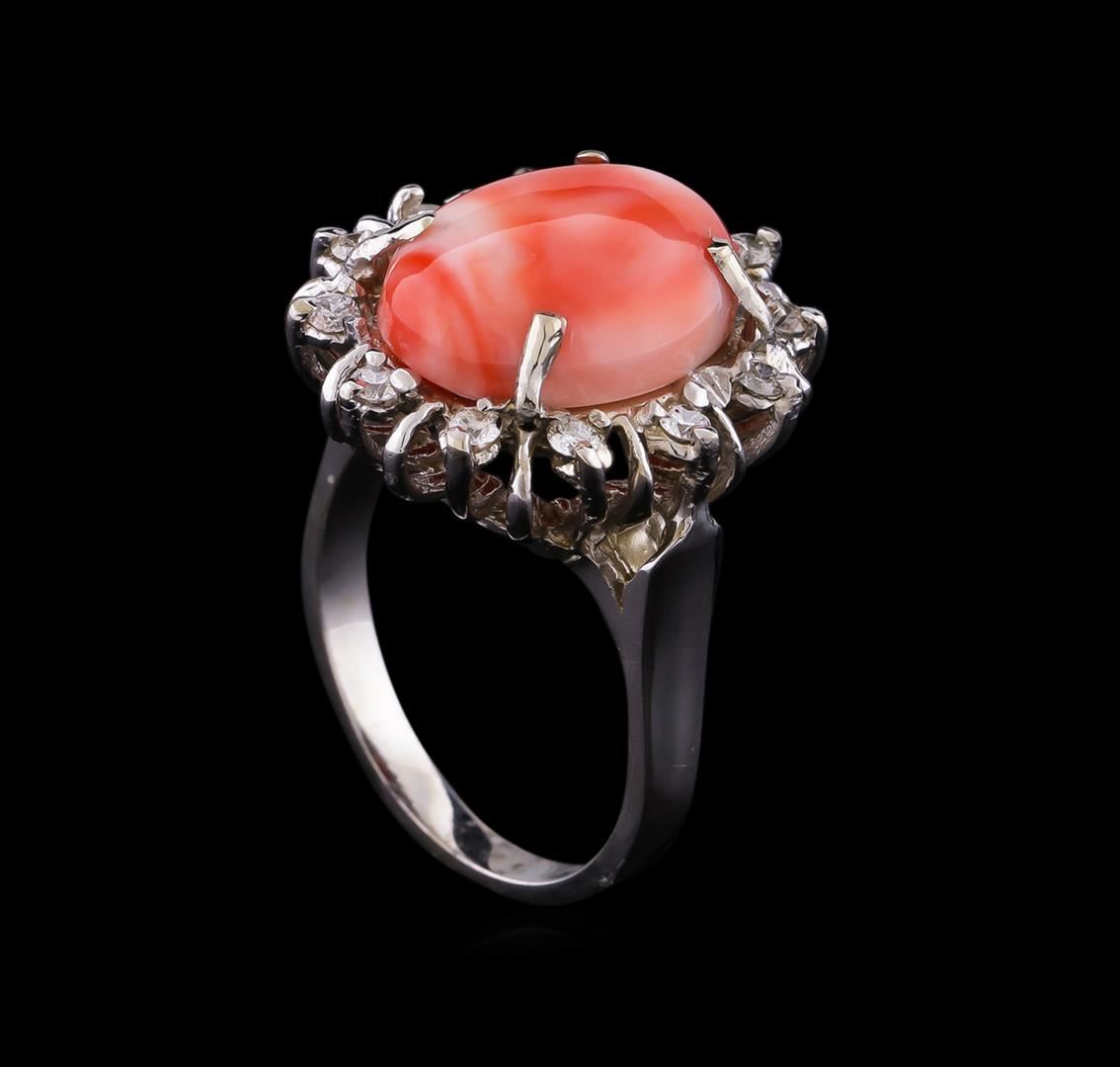 One ring featuring: 14KT white gold weighing 6.55 grams containing one coral center stone with a total weight of 6.18ct and diamonds with a total weight of 0.32ct.