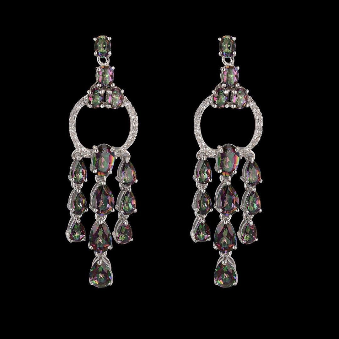 Electronically tested 925 silver ladies cast & assembled mystic quartz and white topaz chandelier earrings with standard backs. Each earring features a stylized mystic quartz and white topaz chandelier design. Bright polish finish. Identified with markings of "925". Condition is new, good workmanship. Twenty-eight prong set oval and pear mixed cut natural mystic quartzs approximate total weight of 6.19ct., clarity is eye clean, cut is good. Transmitting light with no distortion, transparent. Color grade is an average for the group. Graded in the setting. Titanium coating. Twenty prong set round mixed cut natural white topazs approximate total weight of 0.30ct., clarity is eye clean, colorless, very slightly grayish, white color, (GIA W 0/3), cut is good. Transmitting light with no distortion, transparent. Color grade is an average for the group. Graded in the setting.