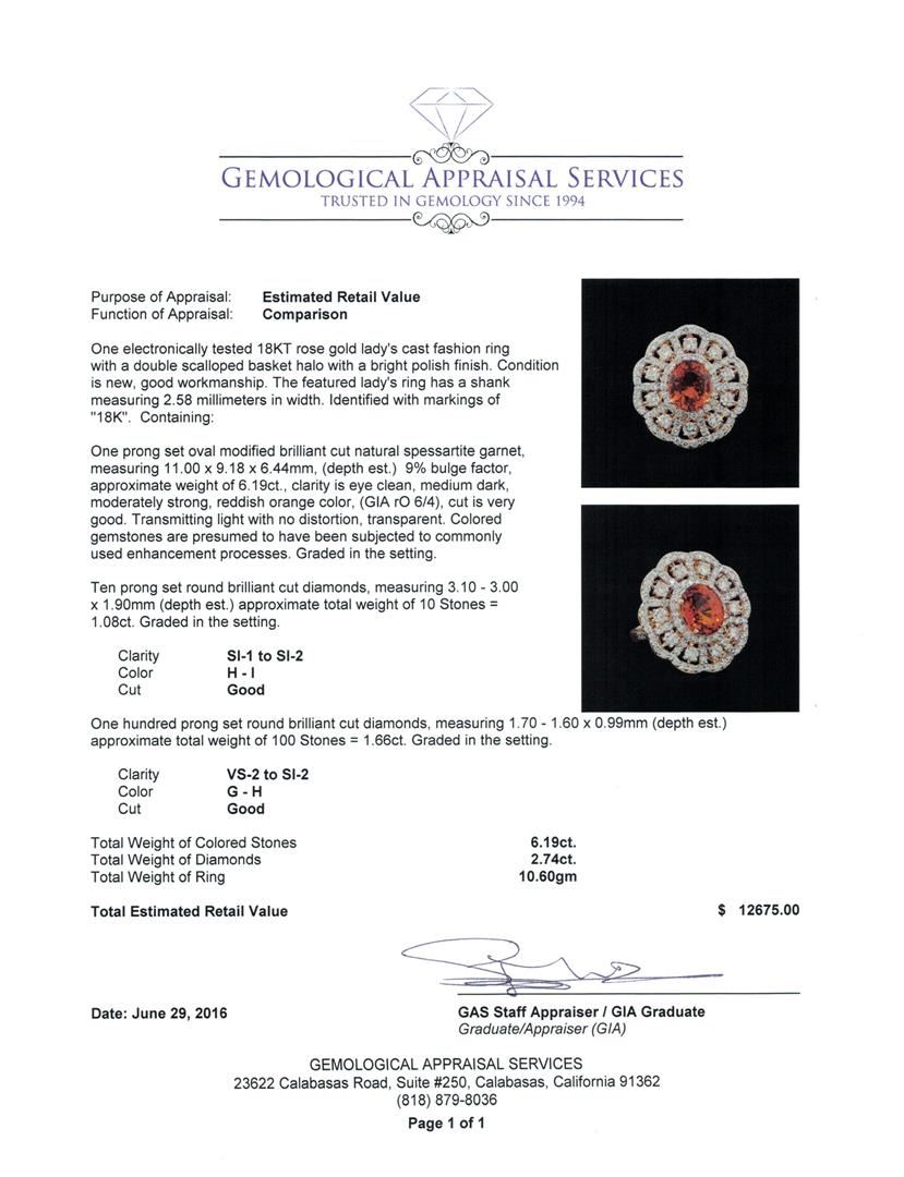 One electronically tested 18KT rose gold lady's cast fashion ring with a double scalloped basket halo with a bright polish finish. The featured lady's ring has a shank measuring 2.58 millimeters in width. Identified with markings of "18K". Condition is new, good workmanship. Containing: One prong set oval modified brilliant cut natural spessartite garnet, measuring 11.00 x 9.18 x 6.44mm, (depth est.) 9%. bulge factor, approximate weight of 6.19ct., clarity is eye clean, medium dark, moderately strong, reddish orange color, (GIA rO 6/4), cut is very good. Transmitting light with no distortion, transparent. Colored gemstones are presumed to have been subjected to commonly used enhancement processes. Graded in the setting. Ten prong set round brilliant cut diamonds, measuring 3.10 - 3.00 x 1.90mm (depth est.) approximate total weight of 10 Stones = 1.08ct. Graded in the setting. Clarity: SI-1 to SI-2. Color: H - I. Cut Good One Hundred prong set round brilliant cut diamonds, measuring 1.70 - 1.60 x 0.99mm (depth est.) approximate total weight of 100 Stones = 1.66ct. Graded in the setting. Clarity: VS-2 to SI-2. Color: G - Good. Total Weight of Colored Stones 6.19ct. Total Weight of Diamonds 2.74ct. Total Weight of Ring 10.60gm. GAS Appraised at $12,675.00.