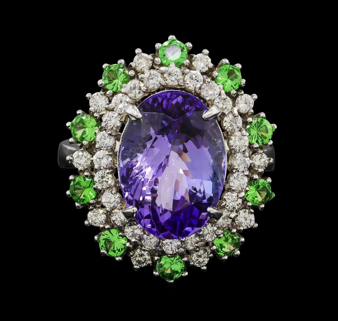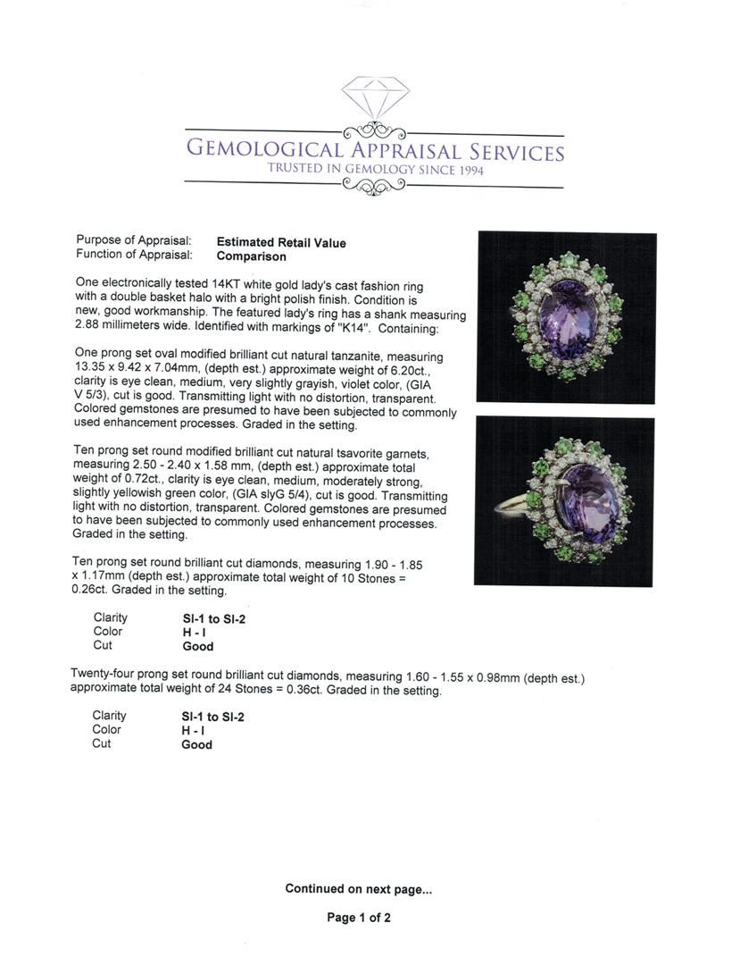 One electronically tested 14KT white gold lady's cast fashion ring with a double basket halo with a bright polish finish. The featured lady's ring has a shank measuring 2.88 millimeters wide. Identified with markings of 'K14'. Condition is new, good workmanship. Containing: One prong set oval modified brilliant cut natural tanzanite, measuring 13.35 x 9.42 x 7.04mm, (depth est.) approximate weight of 6.20ct., clarity is eye clean, medium, very slightly grayish, violet color, (GIA V 5/3), cut is good. Transmitting light with no distortion, transparent. Colored gemstones are presumed to have been subjected to commonly used enhancement processes. Graded in the setting. Ten prong set round modified brilliant cut natural tsavorite garnets, measuring 2.50 - 2.40 x 1.58 mm, (depth est.) approximate total weight of 0.72ct., clarity is eye clean, medium, moderately strong, slightly yellowish green color, (GIA slyG 5/4), cut is good. Transmitting light with no distortion, transparent. Colored gemstones are presumed to have been subjected to commonly used enhancement processes. Graded in the setting. Ten prong set round brilliant cut diamonds, measuring 1.90 - 1.85 x 1.17mm (depth est.) approximate total weight of 10 Stones = 0.26ct. Graded in the setting. Clarity SI-1 to SI-2. Color: H - I Cut Good Twenty-Four prong set round brilliant cut diamonds, measuring 1.60 - 1.55 x 0.98mm (depth est.) approximate total weight of 24 Stones = 0.36ct. Graded in the setting. Clarity SI-1 to SI-2. Color: H - I Cut Good. Total Weight of Colored Stones 6.92ct.. Total Weight of Diamonds 0.62ct.. Total Weight of Ring 7.40gm. GAS Appraised at $10,655.00.