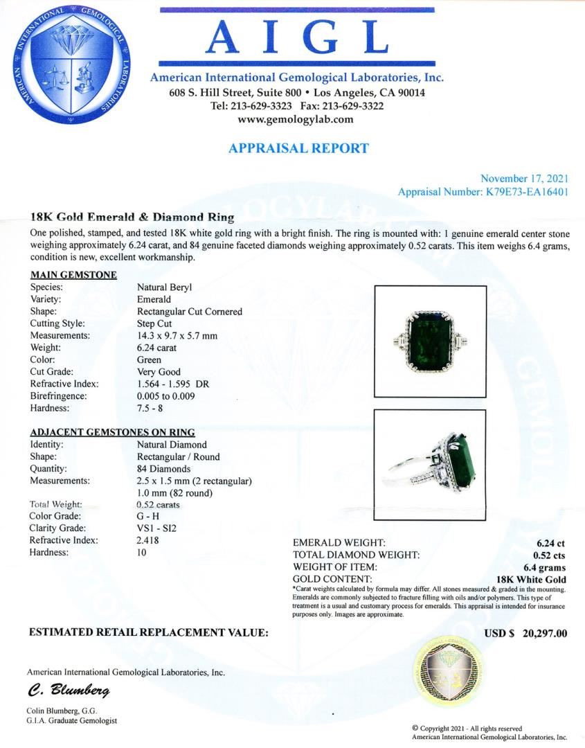 One polished, stamped, and tested 18K white gold ring with a bright finish. The ring is mounted with: 1 genuine emerald center stone weighing approximately 6.24 carat, and 84 genuine faceted diamonds weighing approximately 0.52 carats. This item weighs 6.4 grams, condition is new, excellent workmanship. MAIN GEMSTONE Species: Natural Beryl Variety: Emerald Shape: Rectangular Cut Cornered Cutting Style: Step Cut Measurements: 14.3 x 9.7 x 5.7mm Weight: 6.24 carat Color: Green Cut Grade: Very Good Refractive Index: 1.564 - 1.595 DR Birefringence: 0.005 to 0.009 Hardness: 7.5 - 8 ADJACENT GEMSTONES ON RING Identity: Natural Diamond Shape: Rectangular / Round Quantity: 84 Diamonds Measurements: 2.5 x 1.5mm (2 rectangular) 1.0mm (82 round) Total Weight: 0.52 carats Color Grade: G - H Clarity Grade: VS1 to SI2 Refractive Index: 2.418 Hardness: 10 EMERALD WEIGHT: 6.24ct TOTAL DIAMOND WEIGHT: 0.52ctw WEIGHT OF ITEM: 6.4 grams GOLD CONTENT: 18K White Gold