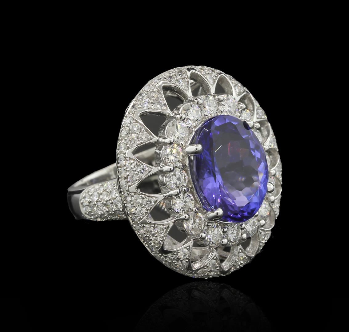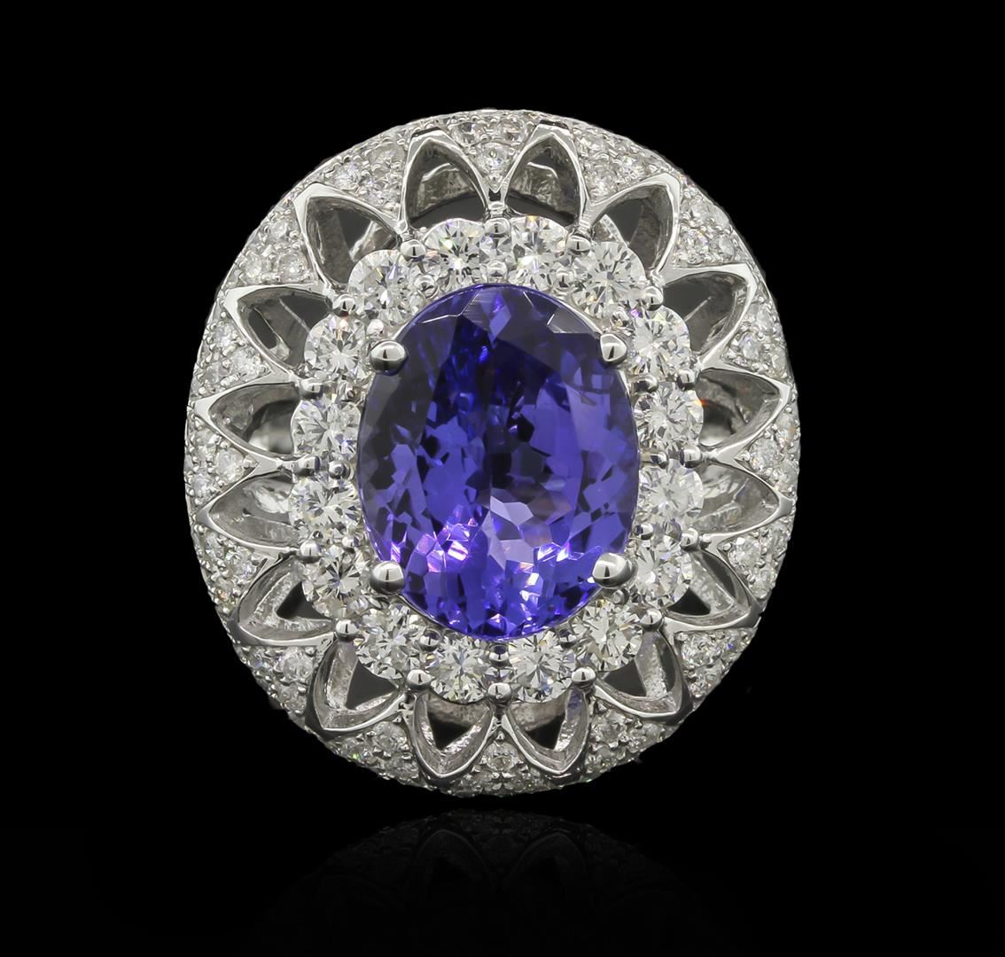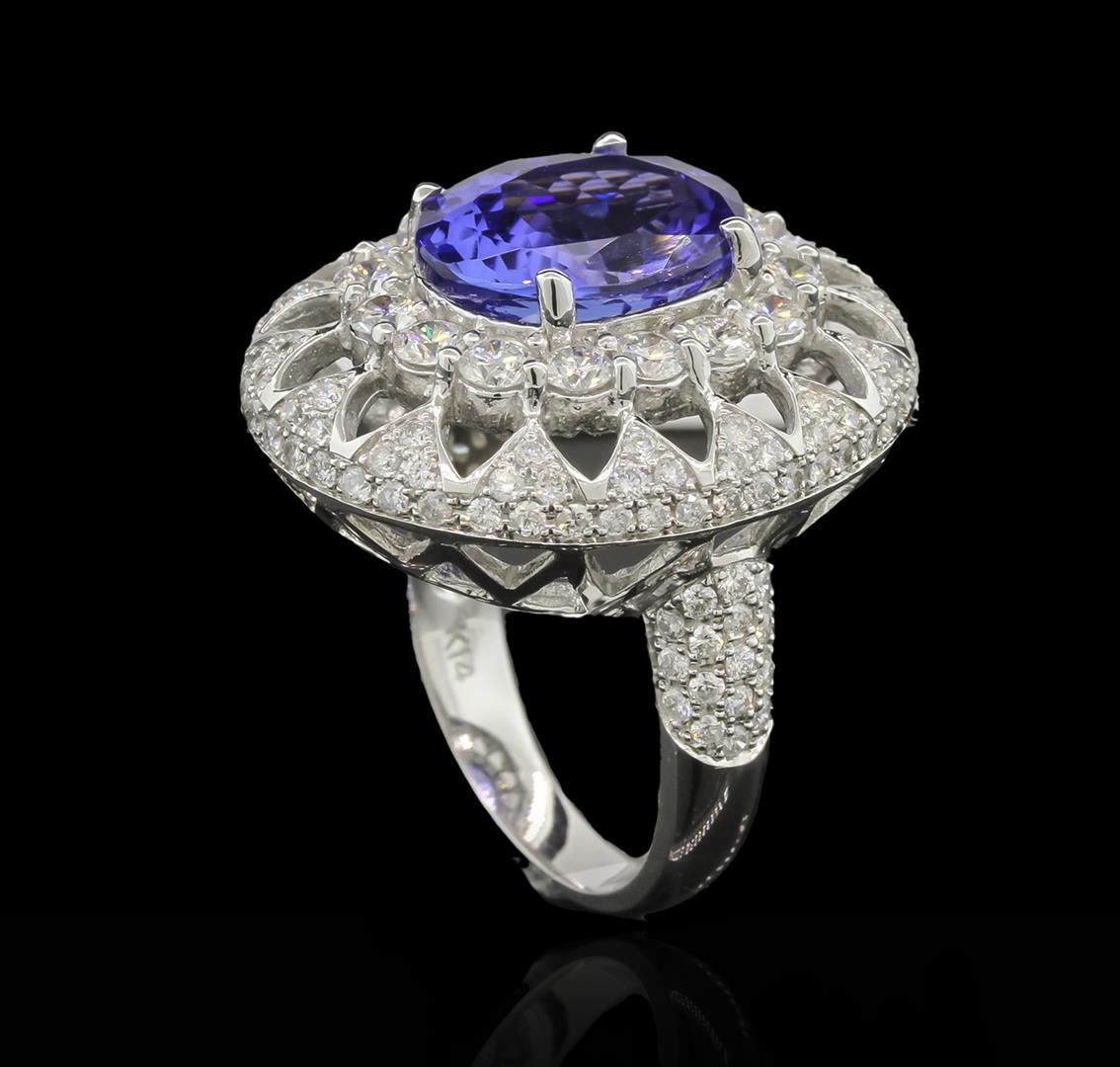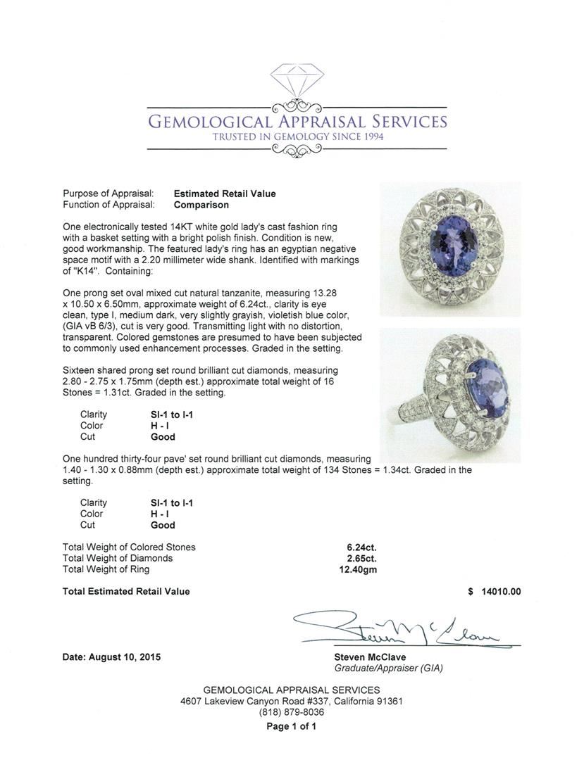 One electronically tested 14KT white gold lady's cast fashion ring with a basket setting with a bright polish finish. The featured lady's ring has an Egyptian negative space motif with a 2.20 millimeter wide shank. Identified with markings of "K14". Condition is new, good workmanship. Containing: One prong set oval mixed cut natural tanzanite, measuring 13.28 x 10.50 x 6.50mm, approximate weight of 6.24ct., clarity is eye clean, type I, medium dark, very slightly grayish, violetish blue color, (GIA vB 6/3), cut is very good. Transmitting light with no distortion, transparent. Colored gemstones are presumed to have been subjected to commonly used enhancement processes. Graded in the setting. Sixteen shared prong set round brilliant cut diamonds, measuring 2.80 - 2.75 x 1.75mm (depth est.) approximate total weight of 16 Stones = 1.31ct. Graded in the setting. Clarity: SI-1 to I-1. Color: H - I. Cut Good One Hundred Thirty-Four pave' set round brilliant cut diamonds, measuring 1.40 - 1.30 x 0.88mm (depth est.) approximate total weight of 134 Stones = 1.34ct. Graded in the setting. Clarity: SI-1 to I-1. Color: H - I. Cut Good. Total Weight of Colored Stones 6.24ct. Total Weight of Diamonds 2.65ct. Total Weight of Ring 12.40gm. GAS Appraised at $14,010.00.