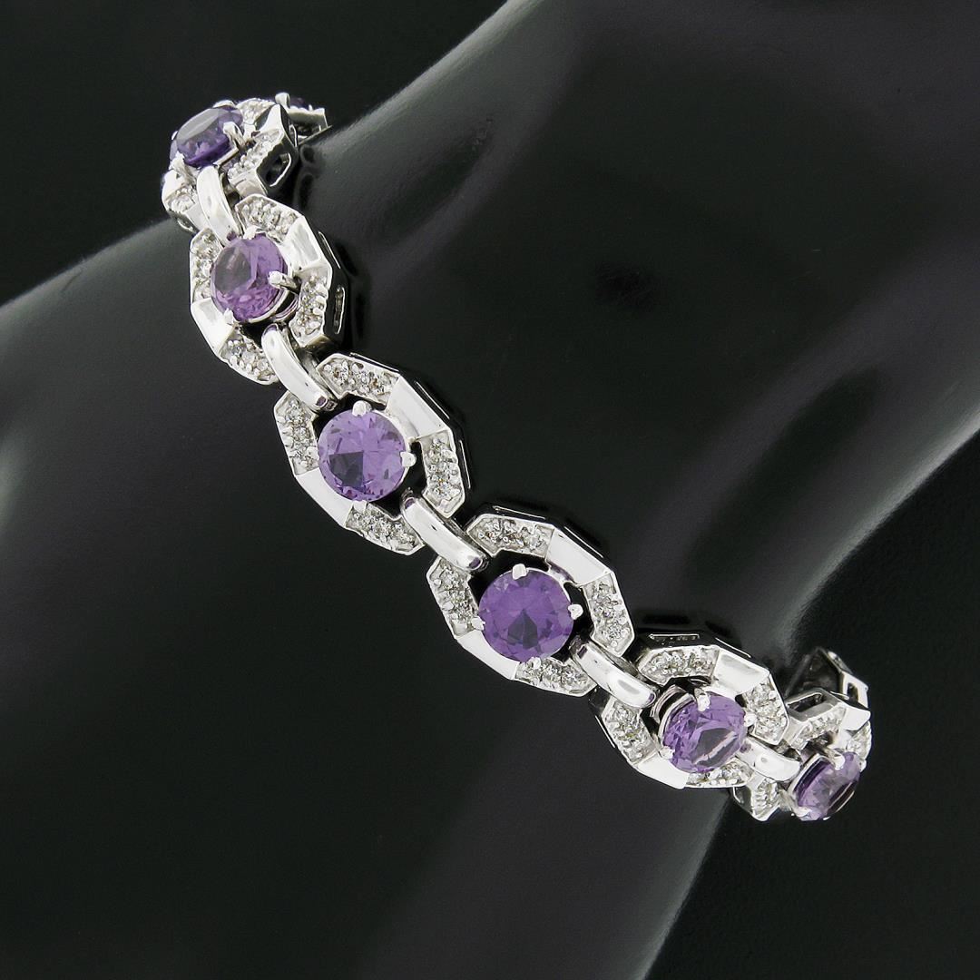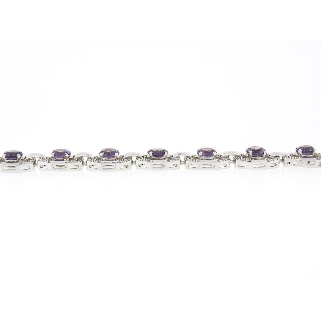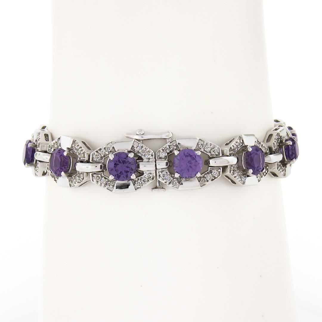 A vintage solid 14k white gold tennis bracelet, featuring 12 round synthetic alexandrites (6mm), and 144 round cut natural diamonds (H/I - VS2-SI2 ; 1.25ctw). It weighs a total of 24.44 grams, measures 10.3mm wide, and measures 6.25 inches in length.