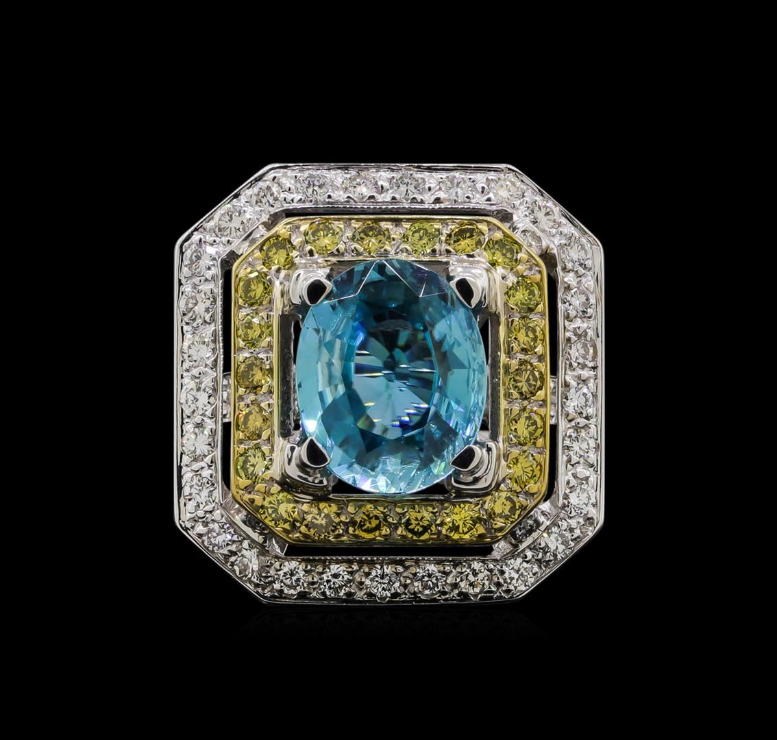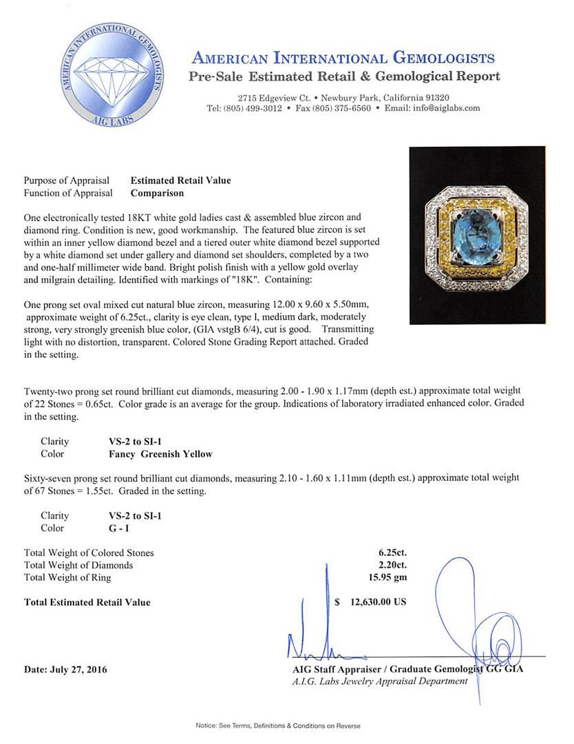 One electronically tested 18KT white gold ladies cast & assembled blue zircon and diamond ring. The featured blue zircon is set within an inner yellow diamond bezel and a tiered outer white diamond bezel supported by a white diamond set under gallery and diamond set shoulders, completed by a two and one-half millimeter wide band. Bright polish finish with a yellow gold overlay and milgrain detailing. Identified with markings of '18K'. Condition is new, good workmanship. Containing: One prong set oval mixed cut natural blue zircon, measuring 12.00 x 9.60 x 5.50mm, approximate weight of 6.25ct., clarity is eye clean, type I, medium dark, moderately strong, very strongly greenish blue color, (GIA vstgB 6/4), cut is good. Transmitting light with no distortion, transparent. Colored Stone Grading Report attached. Graded in the setting. Twenty-Two prong set round brilliant cut diamonds, measuring 2.00 - 1.90 x 1.17mm (depth est.) approximate total weight of 22 Stones = 0.65ct. Color grade is an average for the group. Indications of laboratory irradiated enhanced color. Graded in the setting. Clarity VS-2 to SI-1 Sixty-Seven prong set round brilliant cut diamonds, measuring 2.10 - 1.60 x 1.11mm (depth est.) approximate total weight of 67 Stones = 1.55ct. Graded in the setting. Clarity VS-2 to SI-1. Color: G - I. Total Weight of Colored Stones 6.25ct.. Total Weight of Diamonds 2.20ct.. Total Weight of Ring 15.95gm. AIG Appraised at $12,630.00.
