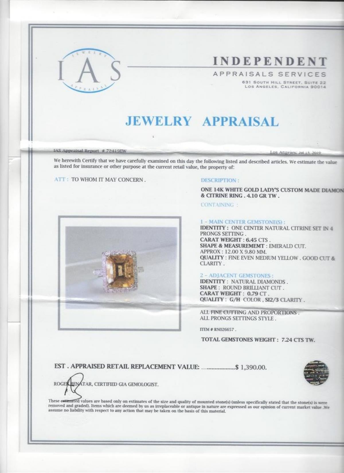 One 6.25ct Citrine and Diamond Ring - 14KT White Gold. IAS certified. See Appraisal for more details.