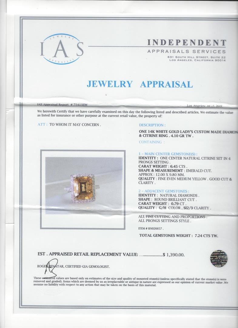 One 6.25ct Citrine and Diamond Ring - 14KT White Gold. IAS certified. See Appraisal for more details.
