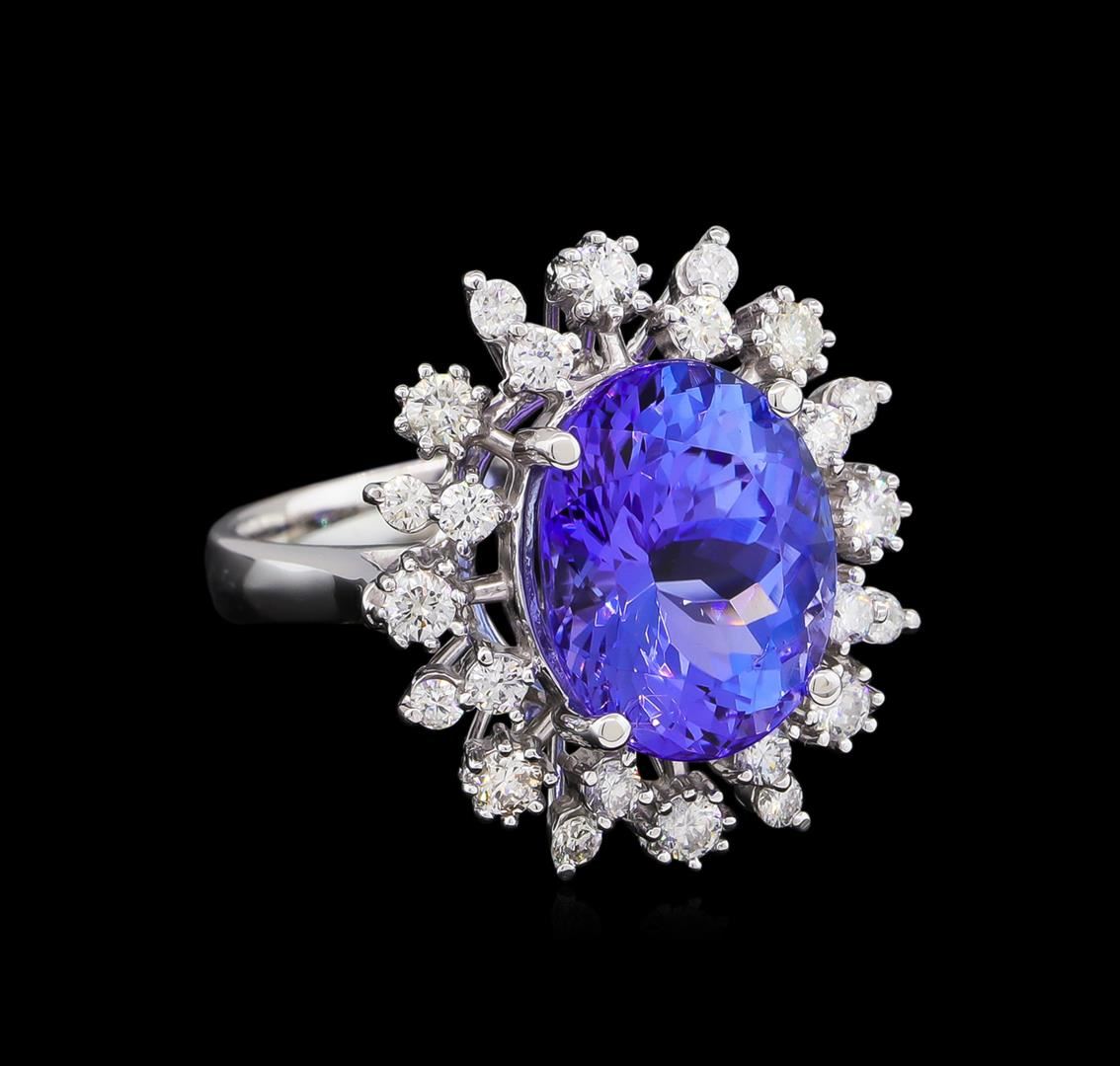 One electronically tested 14KT white gold lady's cast fashion ring with a double basket halo with a bright polish finish. The featured lady's ring has a shank measuring 3.02 millimeters wide. Identified with markings of "K14". Condition is new, good workmanship. Containing: One prong set oval modified brilliant cut natural tanzanite, measuring 12.78 x 10.03 x 7.42mm, approximate weight of 6.25ct., clarity is eye clean, type I, medium light, moderately strong, bluish violet color, (GIA bV 4/4), cut is good. Transmitting light with no distortion, transparent. Colored gemstones are presumed to have been subjected to commonly used enhancement processes. Graded in the setting. Eight prong set round brilliant cut diamonds, measuring 2.40 - 2.30 x 1.41mm (depth est.) approximate total weight of 8 Stones = 0.38ct. Graded in the setting. Clarity: SI-1 to SI-2. Color: H - I. Cut Good Sixteen prong set round brilliant cut diamonds, measuring 1.90 - 1.70 x 1.12mm (depth est.) approximate total weight of 16 Stones = 0.35ct. Graded in the setting. Clarity: VS-2 to SI-2. Color: H - I. Cut Good. Total Weight of Colored Stones 6.25ct. Total Weight of Diamonds 0.73ct. Total Weight of Ring 7.00gm. GAS Appraised at $11,000.00.