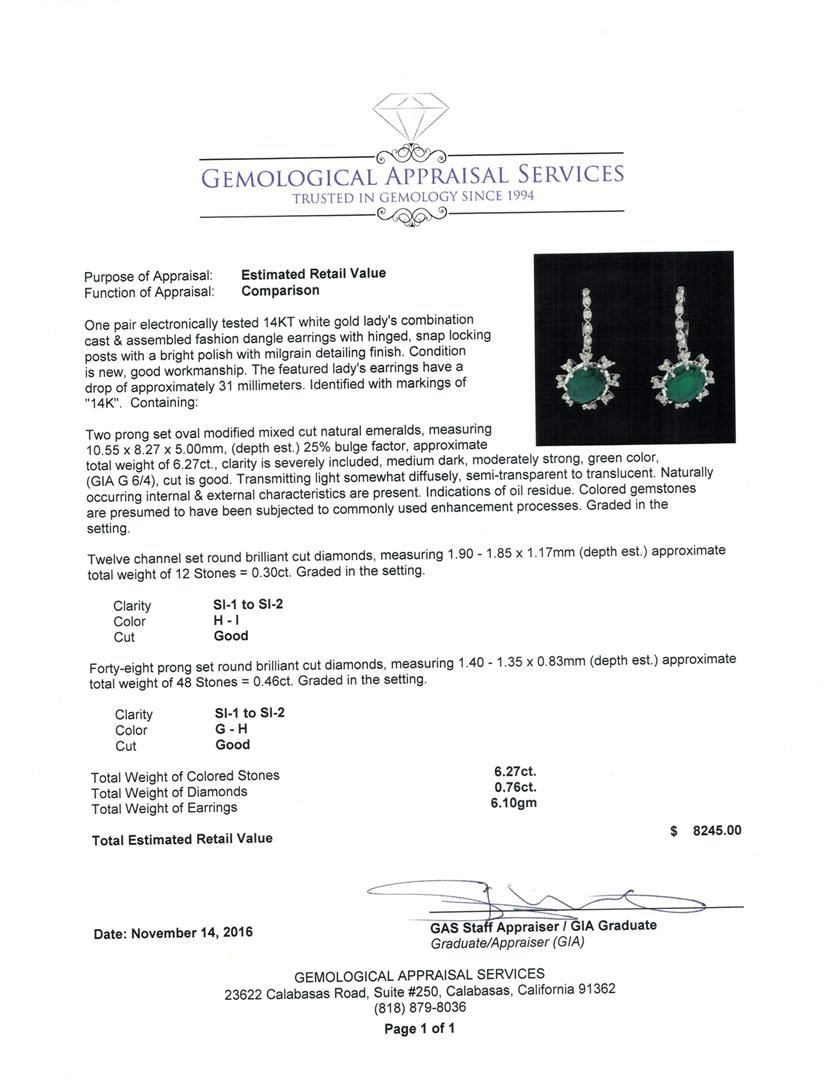 One pair electronically tested 14KT white gold lady's combination cast & assembled fashion dangle earrings with hinged, snap locking posts with a bright polish with milgrain detailing finish. The featured lady's earrings have a drop of approximately 31 millimeters. Identified with markings of '14K'. Condition is new, good workmanship. Containing: Two prong set oval modified mixed cut natural emeralds, measuring 10.55 x 8.27 x 5.00mm, (depth est.) 25%. bulge factor, approximate total weight of 6.27ct., clarity is severely included, medium dark, moderately strong, green color, (GIA G 6/4), cut is good. Transmitting light somewhat diffusely, semi-transparent to translucent. Naturally occurring internal & external characteristics are present. Indications of oil residue. Colored gemstones are presumed to have been subjected to commonly used enhancement processes. Graded in the setting. Twelve channel set round brilliant cut diamonds, measuring 1.90 - 1.85 x 1.17mm (depth est.) approximate total weight of 12 Stones = 0.30ct. Graded in the setting. Clarity SI-1 to SI-2. Color: H - I Cut Good Forty-Eight prong set round brilliant cut diamonds, measuring 1.40 - 1.35 x 0.83mm (depth est.) approximate total weight of 48 Stones = 0.46ct. Graded in the setting. Clarity SI-1 to SI-2. Color: G - H Cut Good. Total Weight of Colored Stones 6.27ct.. Total Weight of Diamonds 0.76ct.. Total Weight of Earrings 6.10gm GAS Appraised at $8,245.00.