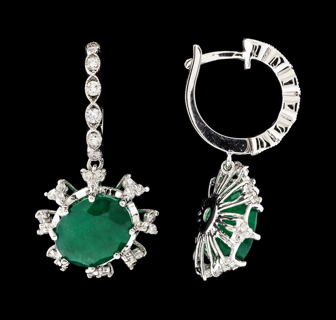 One pair electronically tested 14KT white gold lady's combination cast & assembled fashion dangle earrings with hinged, snap locking posts with a bright polish with milgrain detailing finish. The featured lady's earrings have a drop of approximately 31 millimeters. Identified with markings of '14K'. Condition is new, good workmanship. Containing: Two prong set oval modified mixed cut natural emeralds, measuring 10.55 x 8.27 x 5.00mm, (depth est.) 25%. bulge factor, approximate total weight of 6.27ct., clarity is severely included, medium dark, moderately strong, green color, (GIA G 6/4), cut is good. Transmitting light somewhat diffusely, semi-transparent to translucent. Naturally occurring internal & external characteristics are present. Indications of oil residue. Colored gemstones are presumed to have been subjected to commonly used enhancement processes. Graded in the setting. Twelve channel set round brilliant cut diamonds, measuring 1.90 - 1.85 x 1.17mm (depth est.) approximate total weight of 12 Stones = 0.30ct. Graded in the setting. Clarity SI-1 to SI-2. Color: H - I Cut Good Forty-Eight prong set round brilliant cut diamonds, measuring 1.40 - 1.35 x 0.83mm (depth est.) approximate total weight of 48 Stones = 0.46ct. Graded in the setting. Clarity SI-1 to SI-2. Color: G - H Cut Good. Total Weight of Colored Stones 6.27ct.. Total Weight of Diamonds 0.76ct.. Total Weight of Earrings 6.10gm GAS Appraised at $8,245.00.
