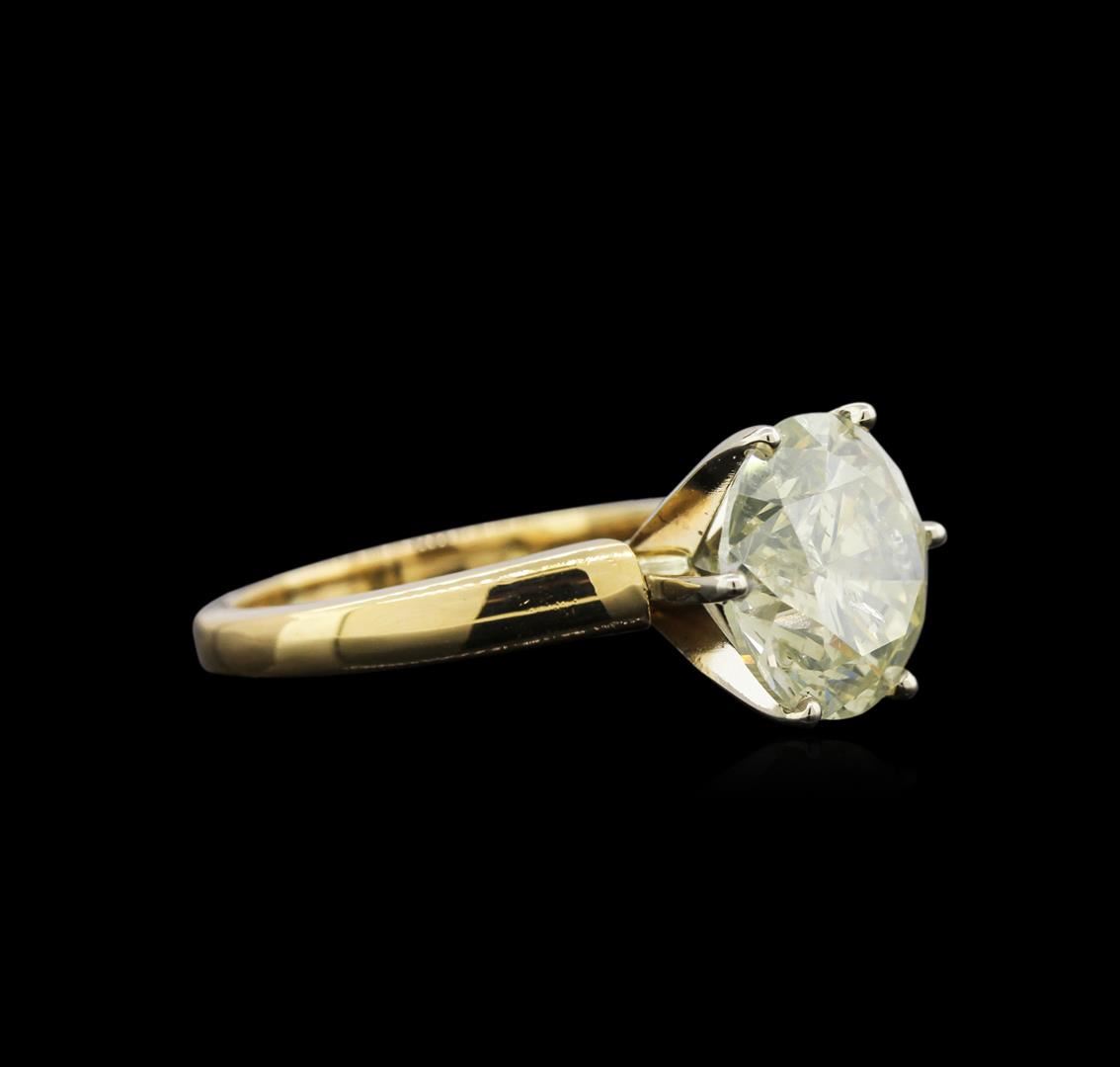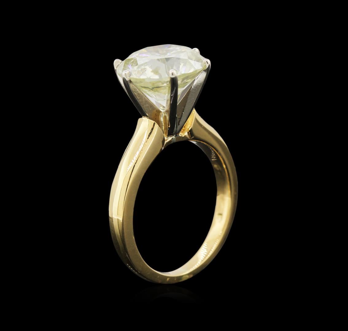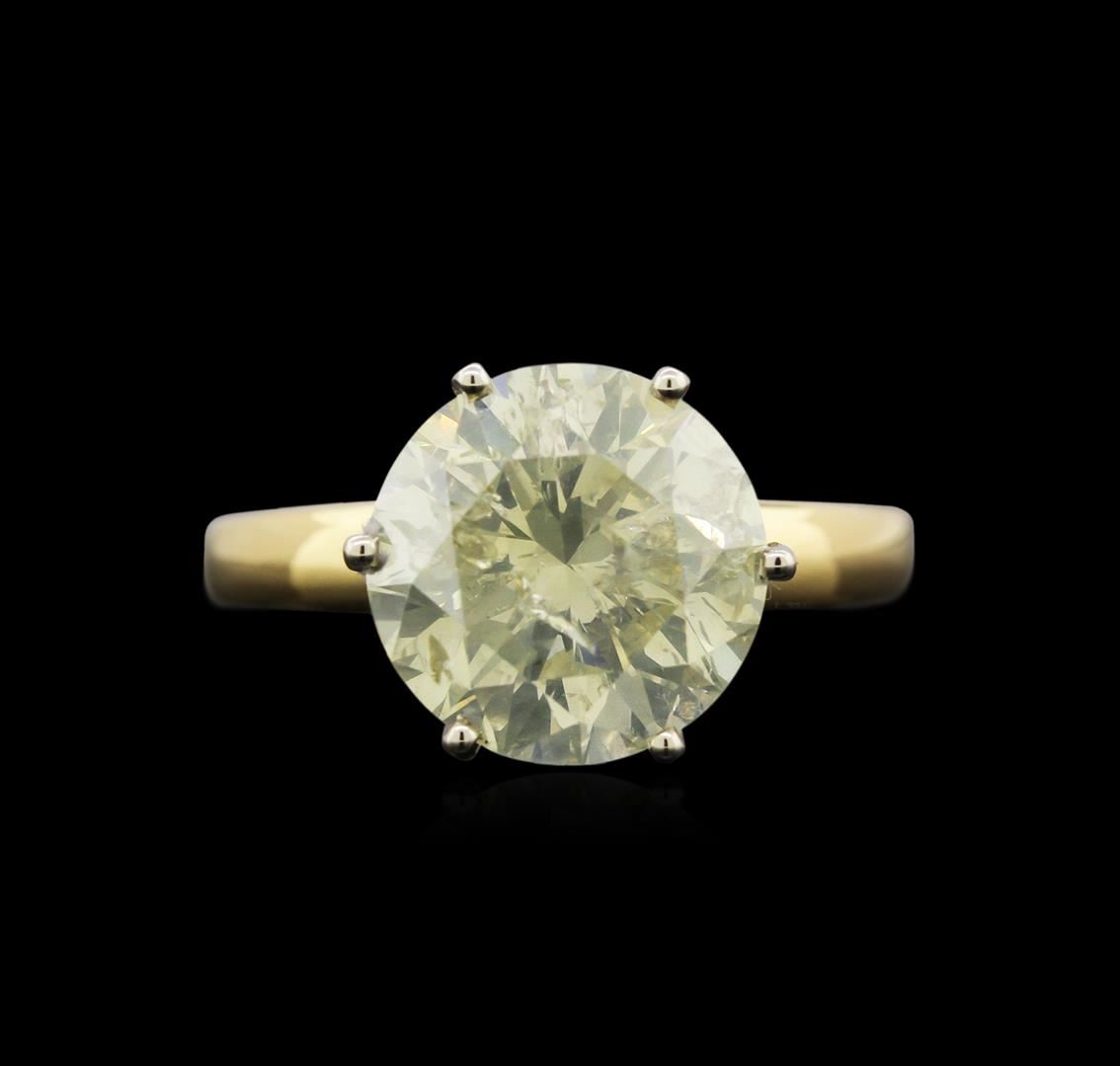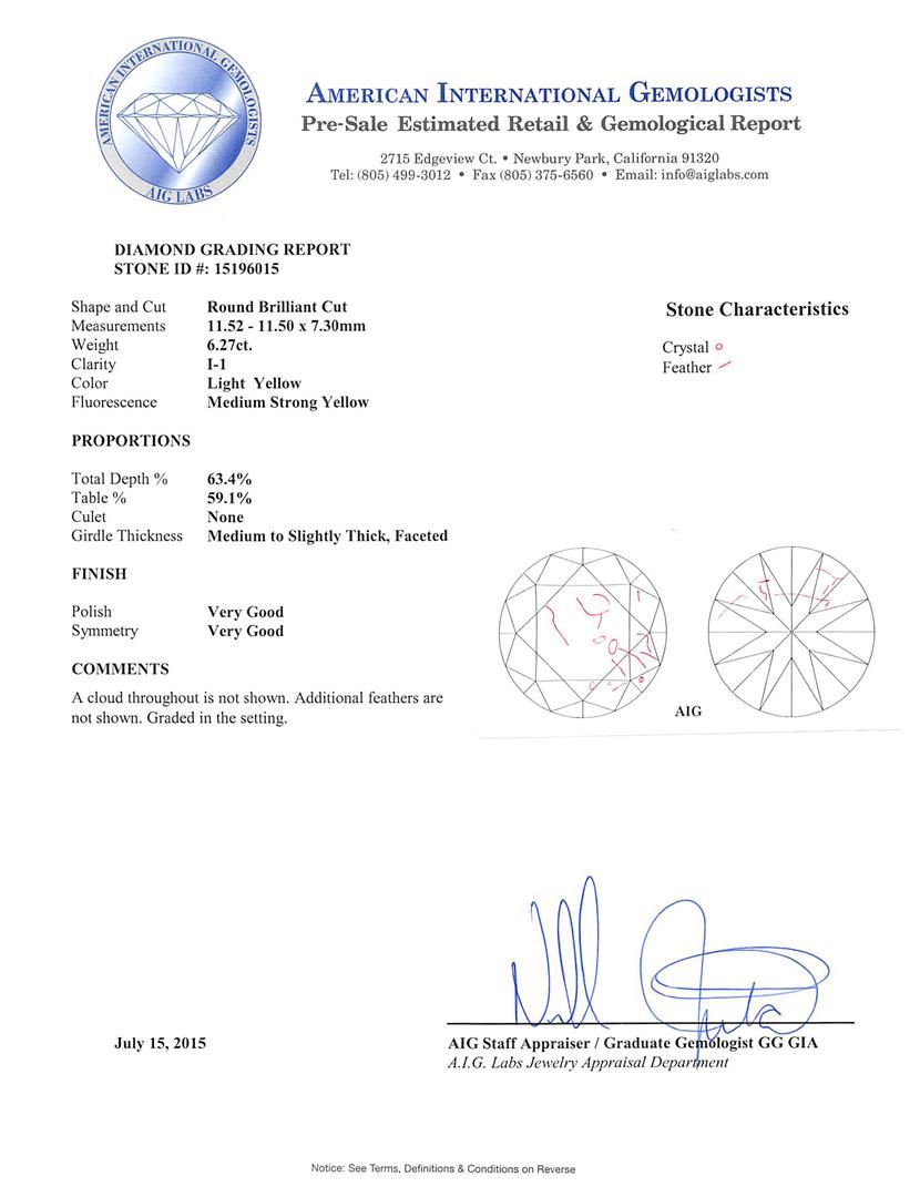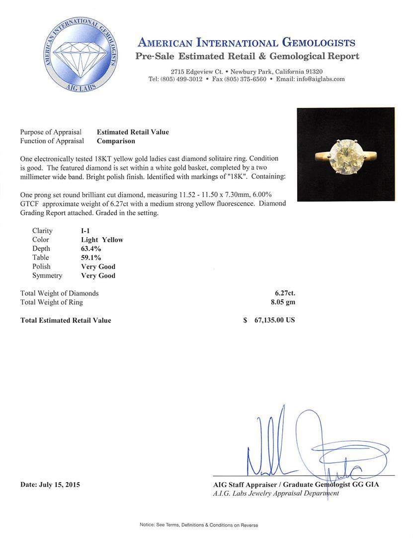 One electronically tested 18KT yellow gold ladies cast diamond solitaire ring. The featured diamond is set within a white gold basket, completed by a two millimeter wide band. Bright polish finish. Identified with markings of "18K". Condition is good. Containing: One prong set round brilliant cut diamond, measuring 11.52 - 11.50 x 7.30mm, 6.00.%. GTCF approximate weight of 6.27ct with a medium strong yellow fluorescence. Diamond Grading Report attached. Graded in the setting. Clarity: I-1. Depth: 63.4%. Table 59.1%. Total Weight of Diamonds 6.27ct. Total Weight of Ring 8.05gm. AIG Appraised at $67,135.00.
