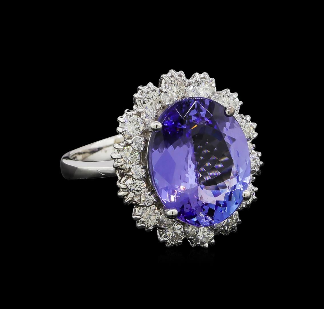 One electronically tested 14KT white gold lady's cast fashion ring with a double basket halo with a bright polish finish. The featured lady's ring has a shank measuring 2.85 millimeters wide. Identified with markings of 'K14'. Condition is new, good workmanship. Containing: One prong set oval modified brilliant cut natural tanzanite, measuring 13.82 x 11.19 x 5.60mm, (depth est.) 3%. bulge factor, approximate weight of 6.28ct., clarity is eye clean, medium, moderately strong, bluish violet color, (GIA bV 5/4), cut is very good. Transmitting light with no distortion, transparent. Colored gemstones are presumed to have been subjected to commonly used enhancement processes. Graded in the setting. Fourteen prong set round brilliant cut diamonds, measuring 2.50 - 2.40 x 1.52mm (depth est.) approximate total weight of 14 Stones = 0.78ct. Graded in the setting. Clarity SI-1 to I-1. Color: H - I Cut Good Fourteen prong set round brilliant cut diamonds, measuring 1.55 - 1.45 x 0.93mm (depth est.) approximate total weight of 14 Stones = 0.18ct. Graded in the setting. Clarity SI-1 to SI-2. Color: H - I Cut Good. Total Weight of Colored Stones 6.28ct.. Total Weight of Diamonds 0.96ct.. Total Weight of Ring 6.30gm GAS Appraised at $12,700.00.