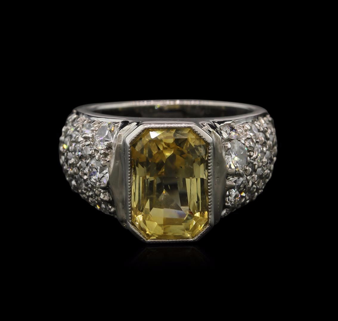 One electronically tested platinum ladies cast sapphire and diamond ring with a bright polish finish. Condition is new. Containing: One bezel set radiant modified brilliant cut natural yellow sapphire, measuring 10.70 x 7.50 x 6.00mm, approximate weight of 6.28ct., clarity is eye clean, light, brownish, yellow color, (GIA Y 3/3), cut is very good. Thirty-Four prong set round brilliant cut diamonds, measuring 3.00 - 1.80 x 1.44mm (depth est.) approximate total weight of 34 Stones = 1.00ct. Clarity: SI-1 to SI-2. Color: K - L, Cut is Good. Colored gemstones are presumed to have been subjected to commonly used enhancement processes. All diamonds and colored gemstones are graded in the mounting, unless otherwise stated. Total Weight of Colored Stones 6.28ct. Total Weight of Diamonds 1.00ct. Total Weight of Ring 9.90 grams. GGL Appraised at $10,215.00.