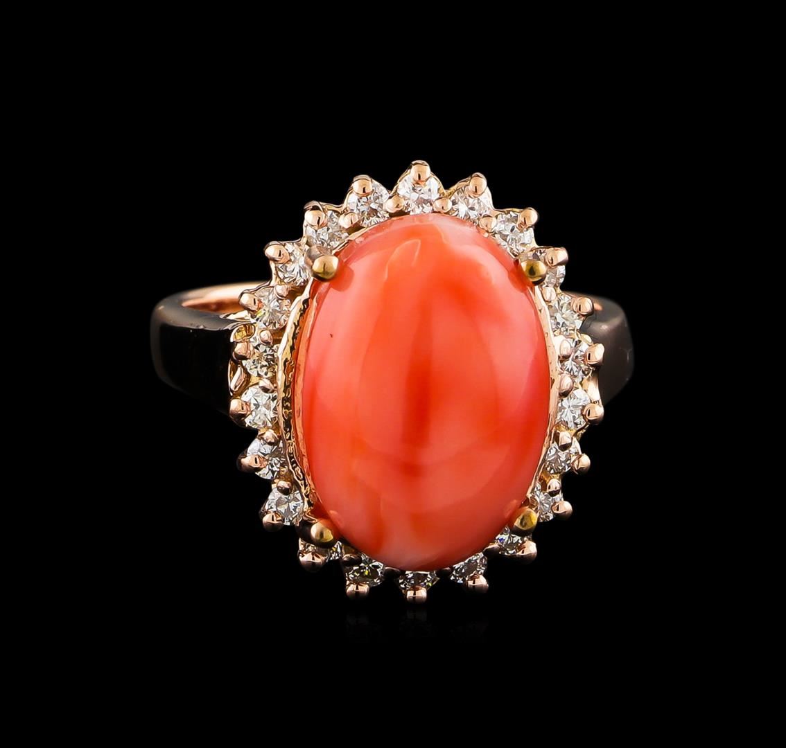 One ring featuring: 14KT rose gold weighing 6.20 grams containing one coral with a total weight of 6.30 and side diamonds with a total weight of 0.46ct.