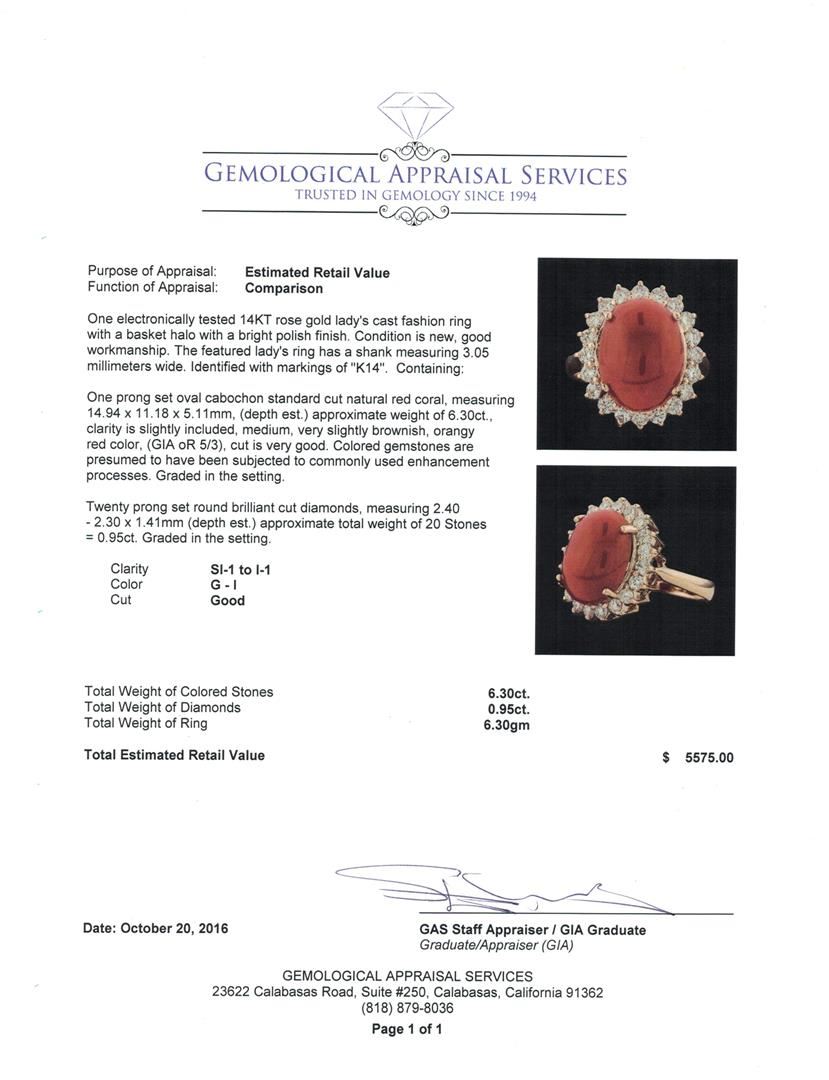 One electronically tested 14KT rose gold lady's cast fashion ring with a basket halo with a bright polish finish. The featured lady's ring has a shank measuring 3.05 millimeters wide. Identified with markings of 'K14'. Condition is new, good workmanship. Containing: One prong set oval cabochon standard cut natural red coral, measuring 14.94 x 11.18 x 5.11mm, (depth est.) approximate weight of 6.30ct., clarity is slightly included, medium, very slightly brownish, orangy red color, (GIA oR 5/3), cut is very good. Colored gemstones are presumed to have been subjected to commonly used enhancement processes. Graded in the setting. Twenty prong set round brilliant cut diamonds, measuring 2.40 - 2.30 x 1.41mm (depth est.) approximate total weight of 20 Stones = 0.95ct. Graded in the setting. Clarity SI-1 to I-1. Color: G - I Cut Good. Total Weight of Colored Stones 6.30ct.. Total Weight of Diamonds 0.95ct.. Total Weight of Ring 6.30gm. GAS Appraised at $5,575.00.