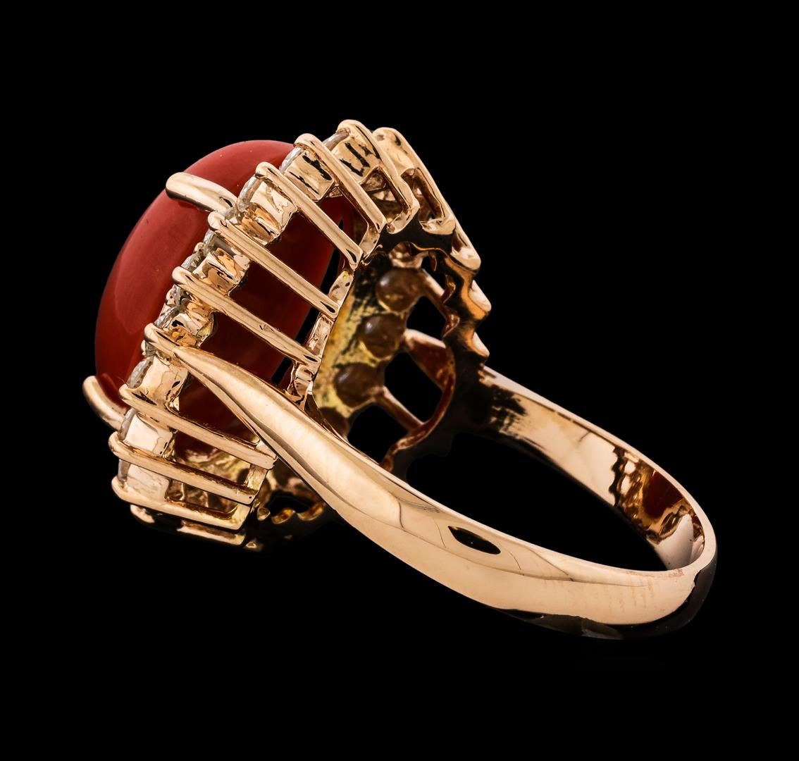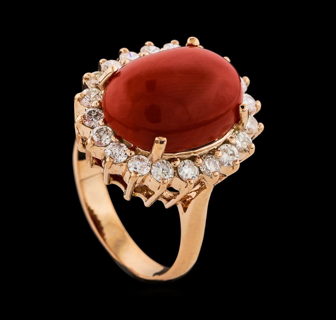 One electronically tested 14KT rose gold lady's cast fashion ring with a basket halo with a bright polish finish. The featured lady's ring has a shank measuring 3.05 millimeters wide. Identified with markings of 'K14'. Condition is new, good workmanship. Containing: One prong set oval cabochon standard cut natural red coral, measuring 14.94 x 11.18 x 5.11mm, (depth est.) approximate weight of 6.30ct., clarity is slightly included, medium, very slightly brownish, orangy red color, (GIA oR 5/3), cut is very good. Colored gemstones are presumed to have been subjected to commonly used enhancement processes. Graded in the setting. Twenty prong set round brilliant cut diamonds, measuring 2.40 - 2.30 x 1.41mm (depth est.) approximate total weight of 20 Stones = 0.95ct. Graded in the setting. Clarity SI-1 to I-1. Color: G - I Cut Good. Total Weight of Colored Stones 6.30ct.. Total Weight of Diamonds 0.95ct.. Total Weight of Ring 6.30gm. GAS Appraised at $5,575.00.