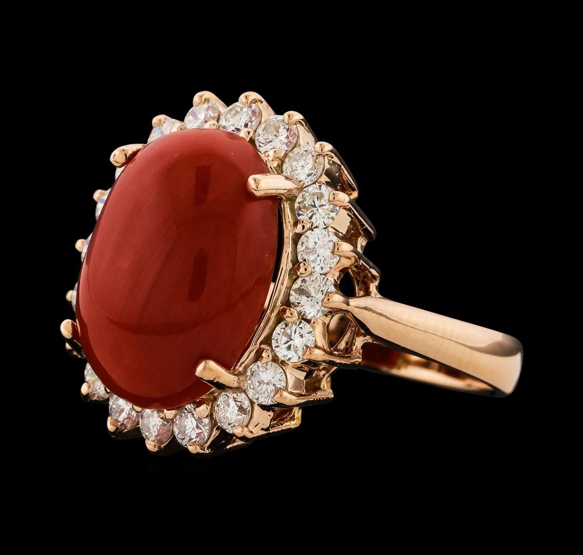 One electronically tested 14KT rose gold lady's cast fashion ring with a basket halo with a bright polish finish. The featured lady's ring has a shank measuring 3.05 millimeters wide. Identified with markings of 'K14'. Condition is new, good workmanship. Containing: One prong set oval cabochon standard cut natural red coral, measuring 14.94 x 11.18 x 5.11mm, (depth est.) approximate weight of 6.30ct., clarity is slightly included, medium, very slightly brownish, orangy red color, (GIA oR 5/3), cut is very good. Colored gemstones are presumed to have been subjected to commonly used enhancement processes. Graded in the setting. Twenty prong set round brilliant cut diamonds, measuring 2.40 - 2.30 x 1.41mm (depth est.) approximate total weight of 20 Stones = 0.95ct. Graded in the setting. Clarity SI-1 to I-1. Color: G - I Cut Good. Total Weight of Colored Stones 6.30ct.. Total Weight of Diamonds 0.95ct.. Total Weight of Ring 6.30gm. GAS Appraised at $5,575.00.