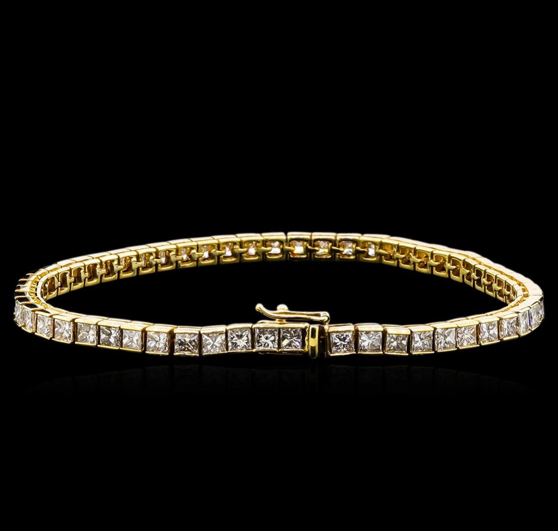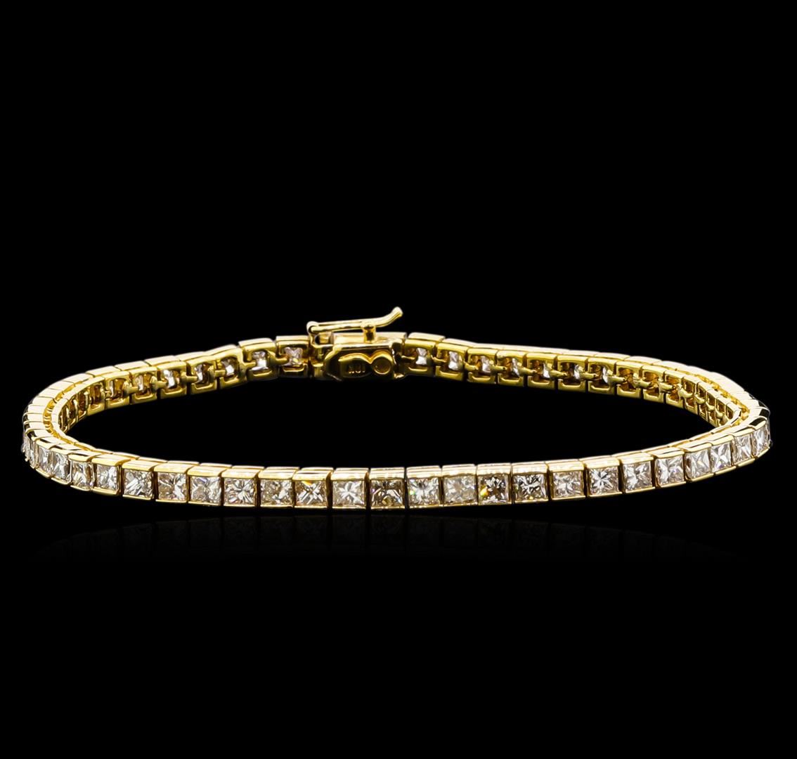 One electronically tested 18KT yellow gold ladies cast & assembled diamond tennis bracelet with a bright polish finish. Seven inch length bracelet composed of a flexible ribbon of diamonds, terminating in a concealed clasp with safety. Identified with markings of "18K". Trademark is AMB. Condition is new, good workmanship. Tennis bracelets & necklaces got their unusual name from an incident involving the U.S. professional tennis player Chris Evert during a tennis match in the 1980's. Evert had been wearing an expensive diamond bracelet, an inline string of individually-set diamonds. Previously these bracelets were known as eternity bracelets. When the clasp snapped during play, she asked the officials to stop the tennis match until the bracelet could be found. Since that day, bracelets and necklaces featuring an inline string of diamonds have been called tennis bracelets and tennis necklaces. Containing: Fifty-Seven channel set princess cut diamonds, measuring 2.80 x 2.60 x 1.82mm (depth est.) approximate total weight of 57 Stones = 6.30ct. Graded in the setting. Clarity: VS-2 to SI-2. Color: G - I. Total Weight of Diamonds 6.30ct. Total Weight of Bracelet 14.12gm. AIG Appraised at $19,085.00.