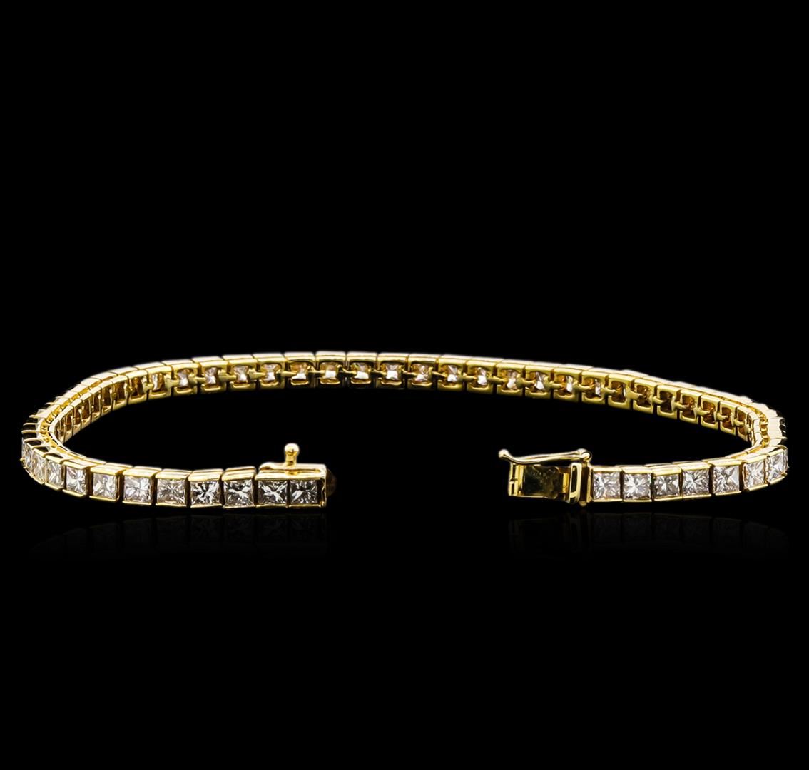 One electronically tested 18KT yellow gold ladies cast & assembled diamond tennis bracelet with a bright polish finish. Seven inch length bracelet composed of a flexible ribbon of diamonds, terminating in a concealed clasp with safety. Identified with markings of "18K". Trademark is AMB. Condition is new, good workmanship. Tennis bracelets & necklaces got their unusual name from an incident involving the U.S. professional tennis player Chris Evert during a tennis match in the 1980's. Evert had been wearing an expensive diamond bracelet, an inline string of individually-set diamonds. Previously these bracelets were known as eternity bracelets. When the clasp snapped during play, she asked the officials to stop the tennis match until the bracelet could be found. Since that day, bracelets and necklaces featuring an inline string of diamonds have been called tennis bracelets and tennis necklaces. Containing: Fifty-Seven channel set princess cut diamonds, measuring 2.80 x 2.60 x 1.82mm (depth est.) approximate total weight of 57 Stones = 6.30ct. Graded in the setting. Clarity: VS-2 to SI-2. Color: G - I. Total Weight of Diamonds 6.30ct. Total Weight of Bracelet 14.12gm. AIG Appraised at $19,085.00.