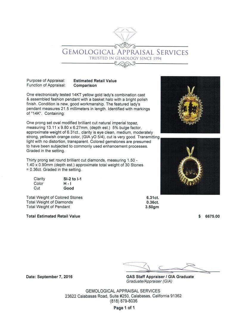 One electronically tested 14KT yellow gold lady's combination cast & assembled fashion pendant with a basket halo with a bright polish finish. The featured lady's pendant measures 21.5 millimeters in length. Identified with markings of '14K'. Condition is new, good workmanship. Containing: One prong set oval modified brilliant cut natural imperial topaz, measuring 13.11 x 9.80 x 6.27mm, (depth est.) 5%. bulge factor, approximate weight of 6.31ct., clarity is eye clean, medium, moderately strong, yellowish orange color, (GIA yO 5/4), cut is very good. Transmitting light with no distortion, transparent. Colored gemstones are presumed to have been subjected to commonly used enhancement processes. Graded in the setting. Thirty prong set round brilliant cut diamonds, measuring 1.50 - 1.40 x 0.90mm (depth est.) approximate total weight of 30 Stones = 0.36ct. Graded in the setting. Clarity SI-2 to I-1. Color: H - I Cut Good. Total Weight of Colored Stones 6.31ct.. Total Weight of Diamonds 0.36ct.. Total Weight of Pendant 3.50gm GAS Appraised at $6,675.00.