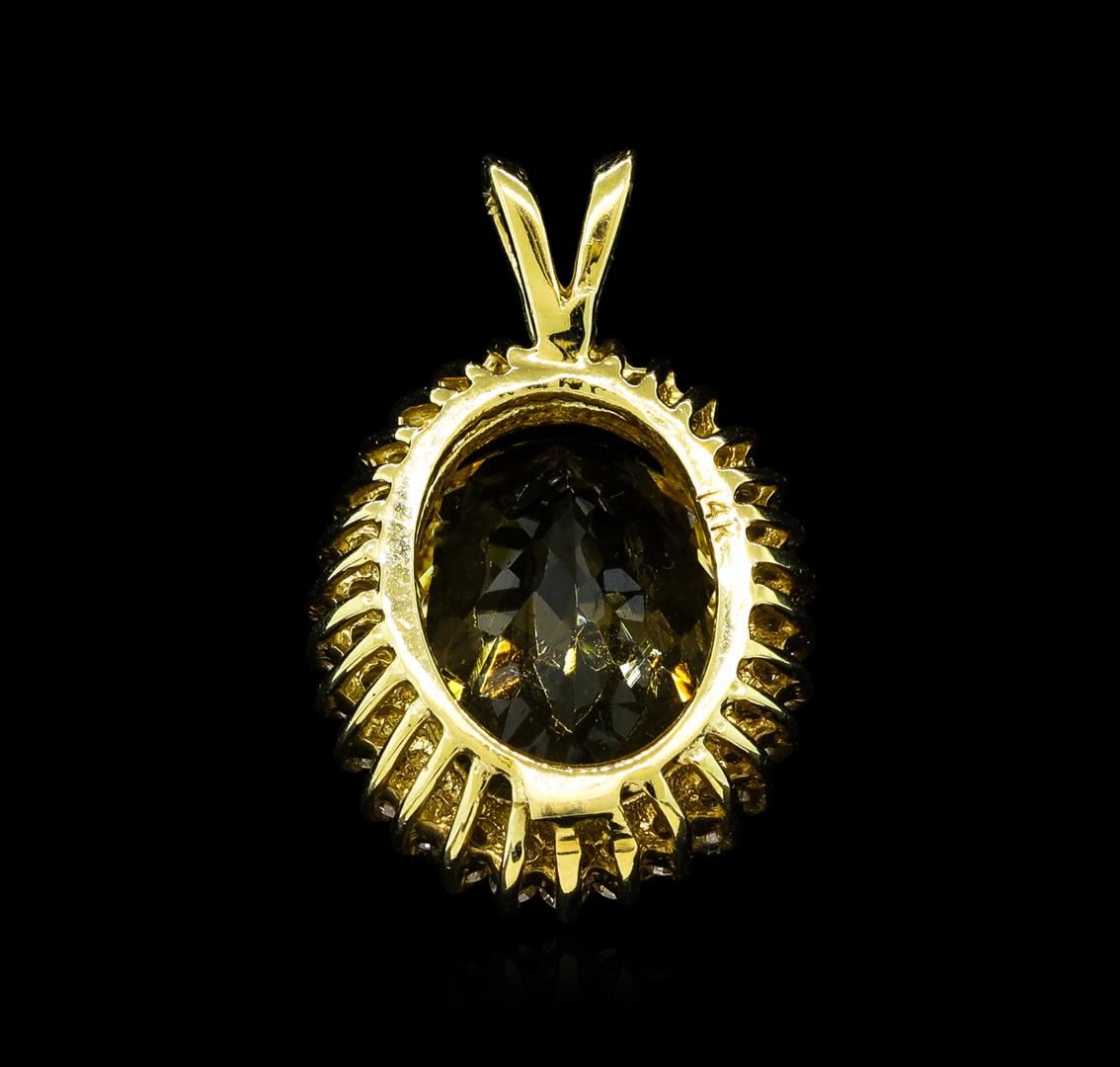 One electronically tested 14KT yellow gold lady's combination cast & assembled fashion pendant with a basket halo with a bright polish finish. The featured lady's pendant measures 21.5 millimeters in length. Identified with markings of '14K'. Condition is new, good workmanship. Containing: One prong set oval modified brilliant cut natural imperial topaz, measuring 13.11 x 9.80 x 6.27mm, (depth est.) 5%. bulge factor, approximate weight of 6.31ct., clarity is eye clean, medium, moderately strong, yellowish orange color, (GIA yO 5/4), cut is very good. Transmitting light with no distortion, transparent. Colored gemstones are presumed to have been subjected to commonly used enhancement processes. Graded in the setting. Thirty prong set round brilliant cut diamonds, measuring 1.50 - 1.40 x 0.90mm (depth est.) approximate total weight of 30 Stones = 0.36ct. Graded in the setting. Clarity SI-2 to I-1. Color: H - I Cut Good. Total Weight of Colored Stones 6.31ct.. Total Weight of Diamonds 0.36ct.. Total Weight of Pendant 3.50gm GAS Appraised at $6,675.00.