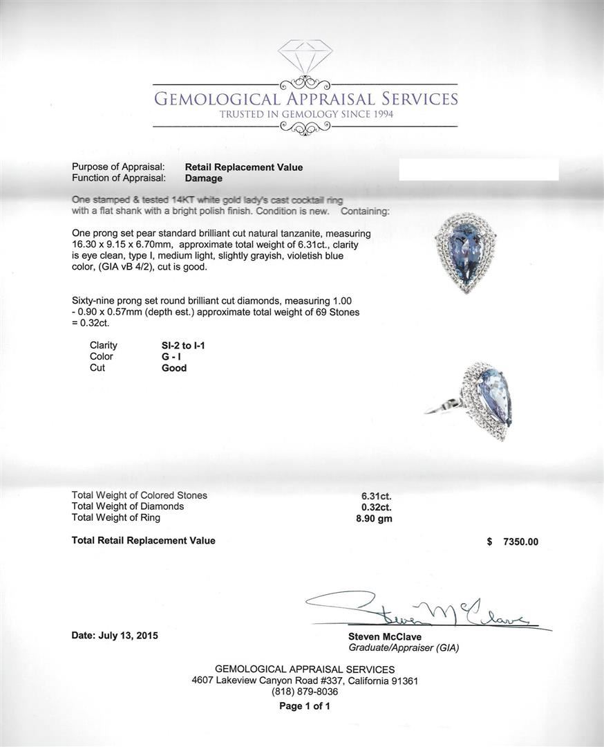 One stamped & tested 14KT white gold lady's cast cocktail ring with a flat shank with a bright polish finish. Condition is new. Containing: One prong set pear standard brilliant cut natural tanzanite, measuring 16.30 x 9.15 x 6.70mm, approximate total weight of 6.31ct., clarity is eye clean, type I, medium light, slightly grayish, violetish blue color, (GIA vB 4/2), cut is good. Sixty-nine prong set round brilliant cut diamonds, measuring 1.00 - 0.90 x 0.57mm (depth est.) approximate total weight of 69 Stones = 0.32ct. Clarity: SI-2 to I-1. Color: G - I. Cut: Good. Total Weight of Colored Stones: 6.31ct. Total Weight of Diamonds: 0.32ct. Total Weight of Ring: 8.90 gm. GAS Appraised at $7,350.00.