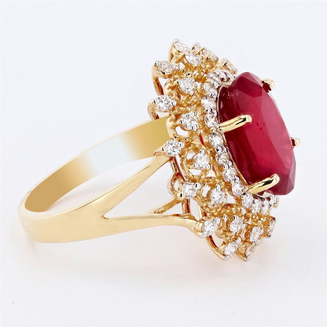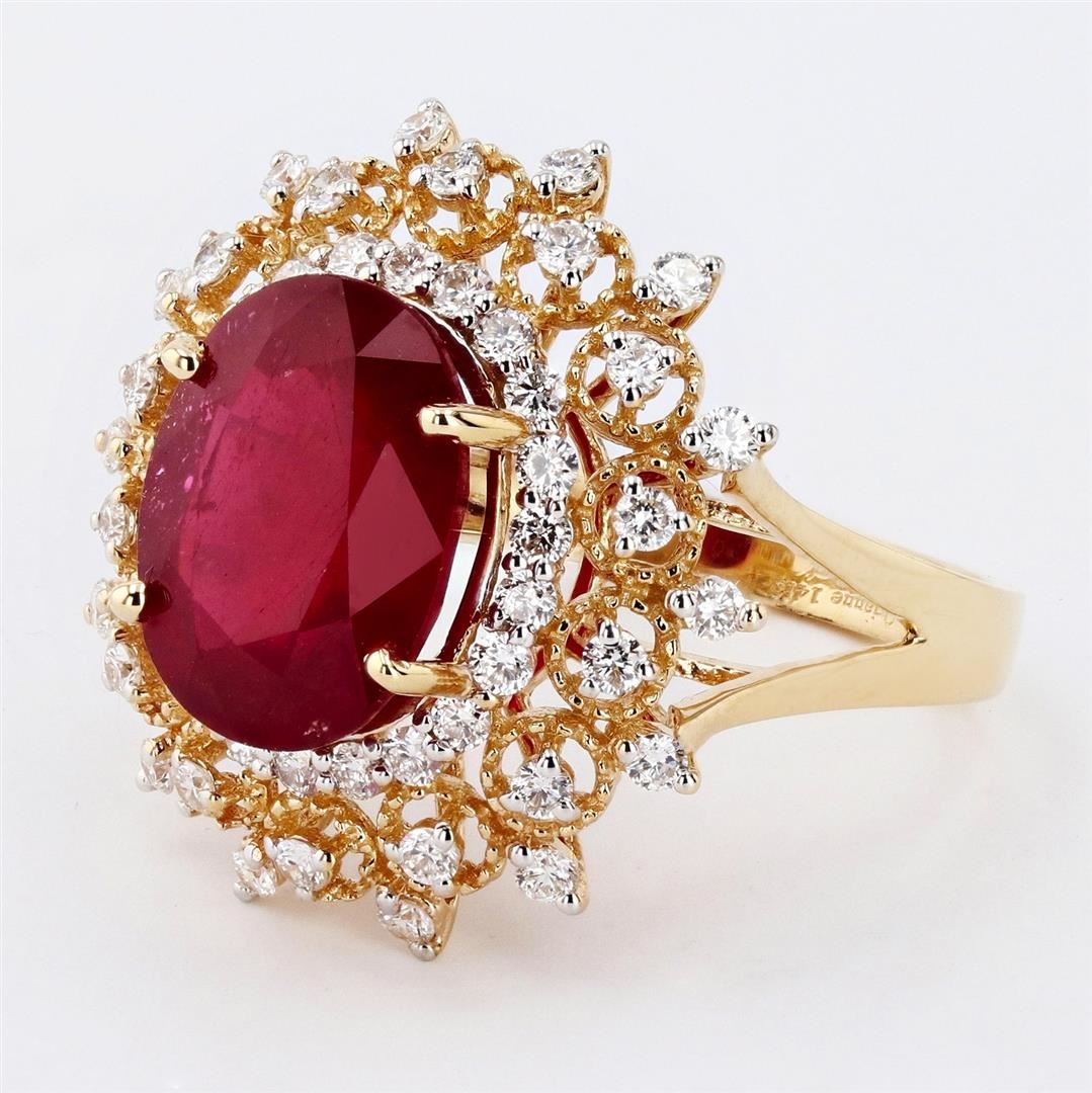 ONE 14K YELLOW GOLD LADY'S CUSTOM MADE DIAMOND & "RUBY COMPOSITE" RING. 5.56 GR TW. CONTAINING: 1 â€" MAIN CENTER GEMSTONE(S): IDENTITY : ONE CENTER "RUBY COMPOSITE" SET IN PRONGS SETTING. CARAT WEIGHT : 6.32 CT. SHAPE & MEASUREMEMT : OVAL CUT. QUALITY : DARK EVEN RED COLOR. FINE CUTTING. "NATURALLY OCCURRING INTERNAL & EXTERNAL CHARACTERISTICS ARE PRESENT . INDICATIONS OF LABORATORY HIGH TEMPERATURE HEAT TREATEMENT WITH GLASS & FLUX ADDICTIVES. 2 â€" ADJACENT GEMSTONES: IDENTITY : NATURAL DIAMONDS SHAPE : ROUND BRILLIANT CUT. CARAT WEIGHT : 0.80CTW. QUALITY: G COLOR, VS CLARITY. ALL FINE CUTTING AND PROPORTIONS. ALL PRONGS SETTINGS STYLE. TOTAL GEMSTONES WEIGHT : 7.12 CTS TW.