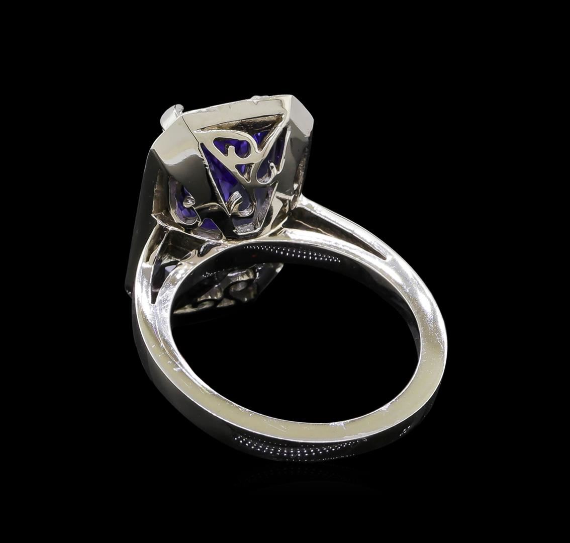 One electronically tested 14KT white gold lady's cast fashion ring with a cathedral shank with a halo with a bright polish finish. The featured lady's ring has a shank measuring 2.10 millimeters wide. Identified with markings of '14K'. Condition is new, good workmanship. Containing: One prong set rectangular cushion modified brilliant cut natural tanzanite, measuring 14.74 x 8.75 x 5.90mm, (depth est.) 5%. bulge factor, approximate weight of 6.32ct., clarity is eye clean, medium light, moderately strong, violet color, (GIA V 4/4), cut is very good. Transmitting light with no distortion, transparent. Colored gemstones are presumed to have been subjected to commonly used enhancement processes. Graded in the setting. Twenty-Two bead set round brilliant cut diamonds, measuring 1.50 - 1.40 x 0.90mm (depth est.) approximate total weight of 22 Stones = 0.25ct. Graded in the setting. Clarity SI-1 to I-1. Color: H - I Cut Good. Total Weight of Colored Stones 6.32ct.. Total Weight of Diamonds 0.25ct.. Total Weight of Ring 7.20gm GAS Appraised at $9,025.00.