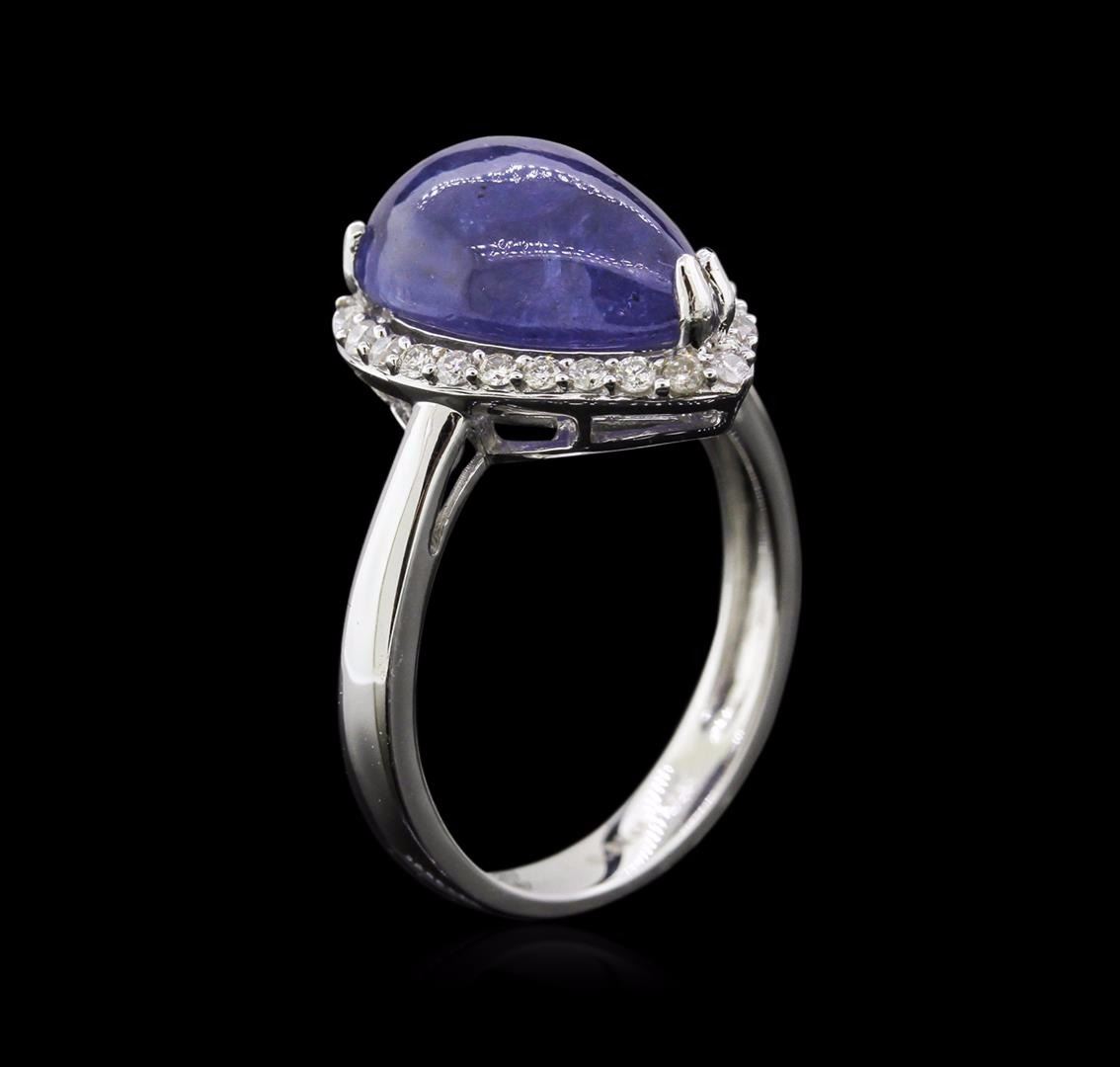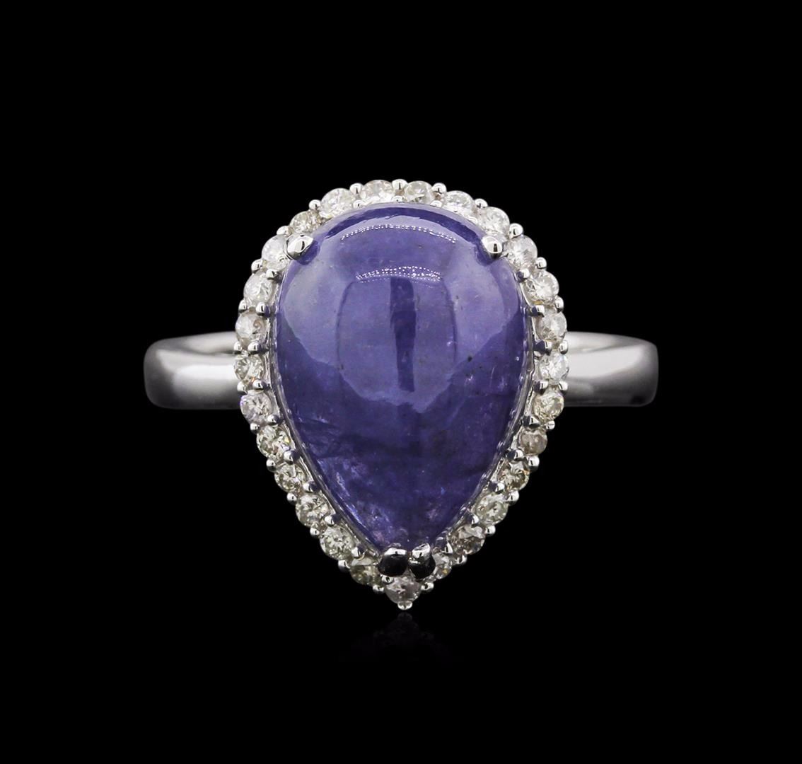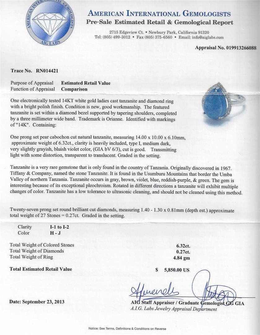 One electronically tested white gold ladies cast tanzanite and diamond ring with a bright polish finish. Condition is new, good workmanship. The featured tanzanite is set within a diamond bezel supported by tapering shoulders, completed by a three millimeter wide band. Trademark is Orianne. Identified with markings of" 14K". Containing: One prong set pear cabochon cut natural tanzanite, measuring 14.00 x 10.00 x 6.10mm, approximate weight of6.32ct., clarity is heavily included, type I, medium dark, very slightly grayish, bluish violet color, (GIA bV 6/3),cut is good. Transmitting light with some distortion, transparent to translucent. Graded in the setting. Tanzanite is a very rare gemstone that is only found in the country of Tanzania. Originally discovered in 1967.Tiffany & Company, named the stone Tanzanite. It is found in the Usumbura Mountains that border the UmbaValley of northern Tanzania. Tanzanite occurs in gray, brown, violet, blue, reddish-purple, & green. The gem is interesting because of its exceptional pleochroism. Rotated in different directions a tanzanite will exhibit multiple changes of color. Tanzanite has a low tolerance to ultrasonic cleaning, and should not be cleaned using this method. Twenty-seven prong set round brilliant cut diamonds, measuring 1.40 - 1.30 x 0.81mm (depth est.) approximate total weight of 27 Stones = 0.27ct. Graded in the setting. Clarity: 1-1 to 1-2.Color: H - J. AIG Appraised at $5,850.00.