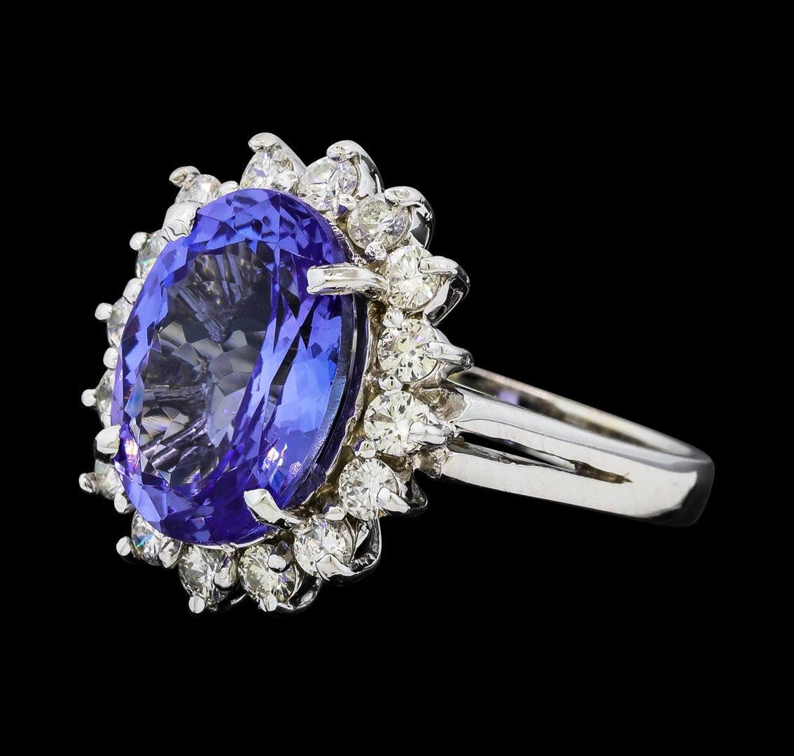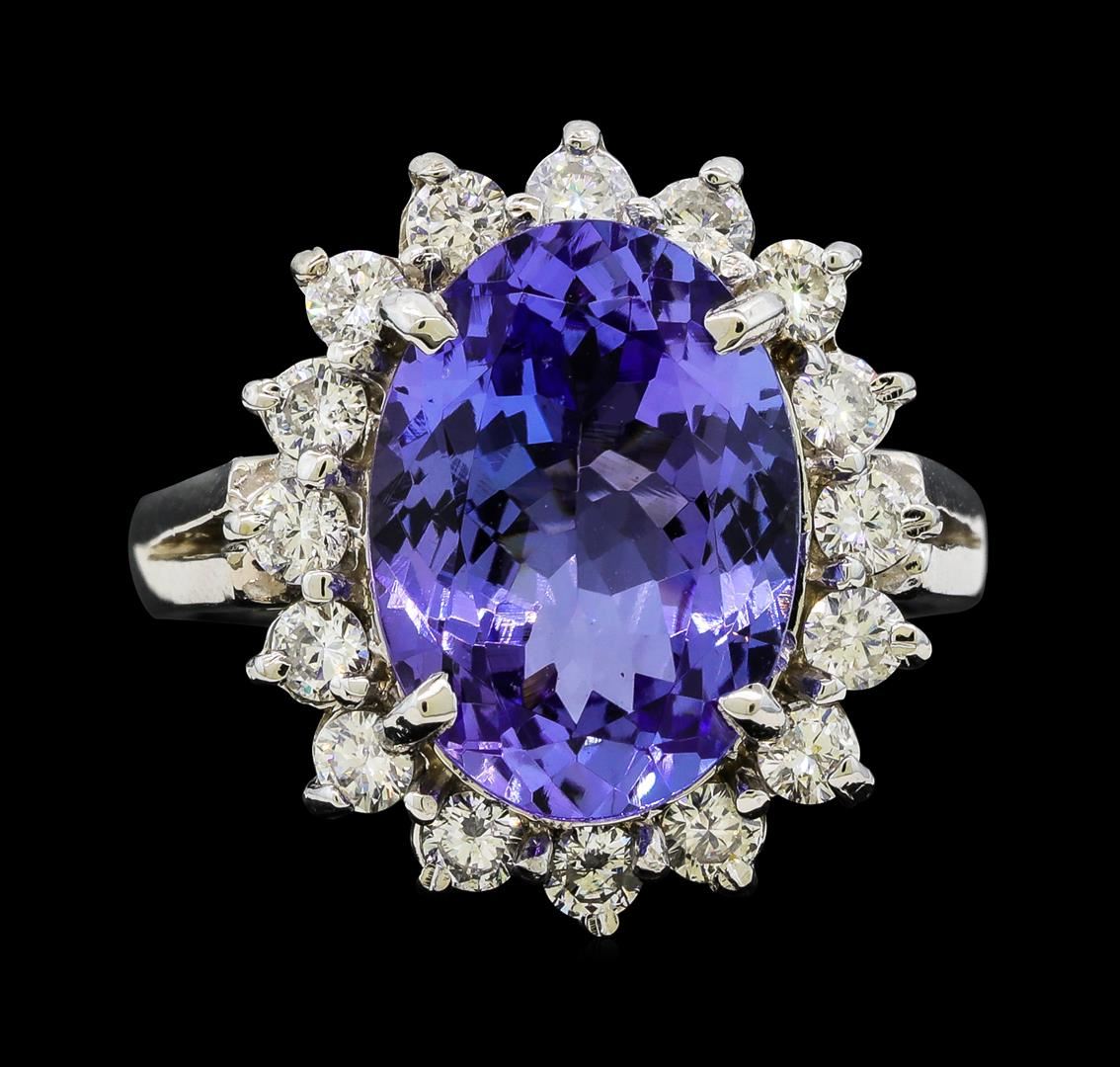 One electronically tested 14KT white gold lady's cast fashion ring with a split shank basket halo with a bright polish finish. The featured lady's ring has a shank measuring 2.71 millimeters wide. Identified with markings of 'K14'. Condition is new, good workmanship. Containing: One prong set oval modified brilliant cut natural tanzanite, measuring 14.00 x 10.10 x 6.04mm, (depth est.) 5%. bulge factor, approximate weight of 6.33ct., clarity is eye clean, medium light, moderately strong, violet color, (GIA V 4/4), cut is very good. Transmitting light with no distortion, transparent. Colored gemstones are presumed to have been subjected to commonly used enhancement processes. Graded in the setting. Sixteen prong set round brilliant cut diamonds, measuring 2.50 - 2.40 x 1.47mm (depth est.) approximate total weight of 16 Stones = 0.86ct. Graded in the setting. Clarity SI-1 to SI-2. Color: H - I Cut Good. Total Weight of Colored Stones 6.33ct.. Total Weight of Diamonds 0.86ct.. Total Weight of Ring 7.50gm. GAS Appraised at $10,315.00.