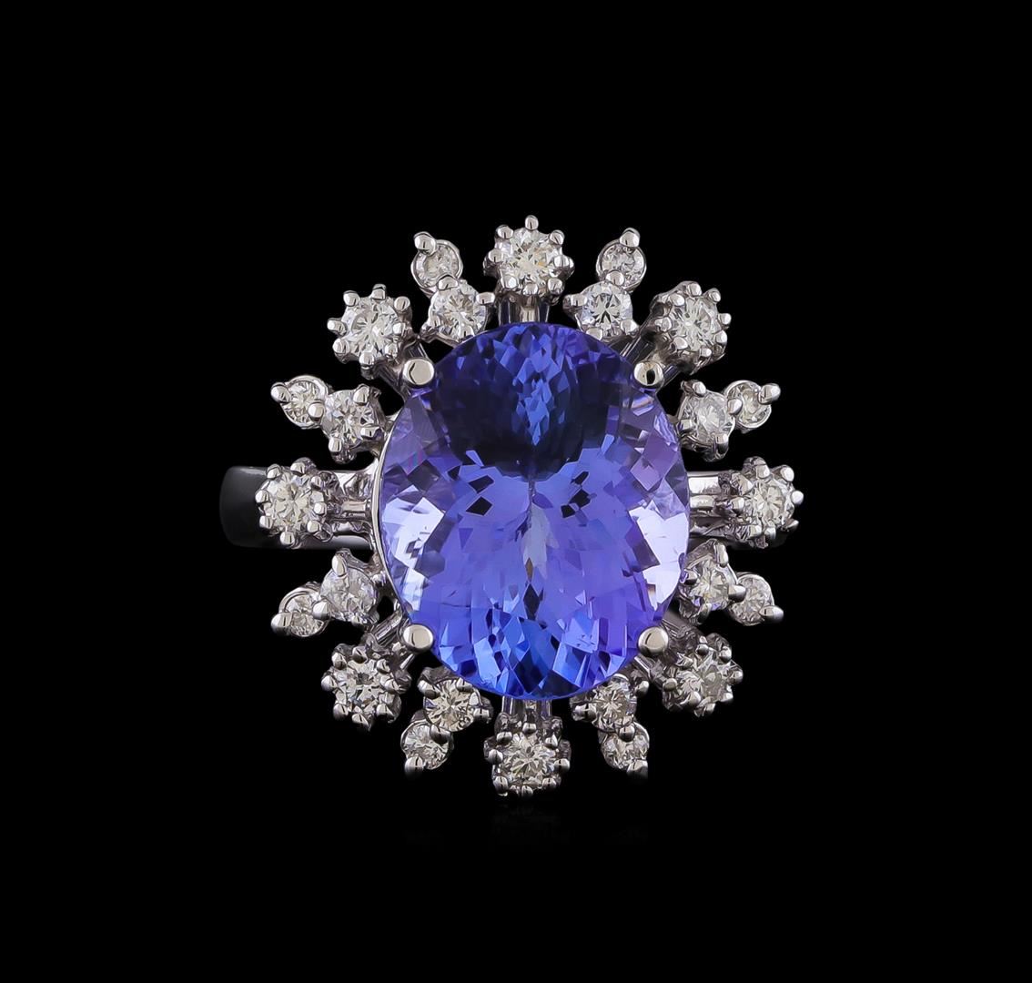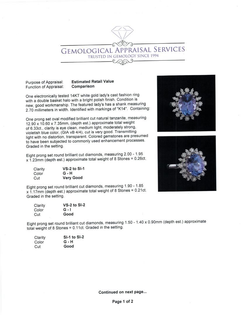 One electronically tested 14KT white gold lady's cast fashion ring with a double basket halo with a bright polish finish. The featured lady's has a shank measuring 2.70 millimeters in width. Identified with markings of "K14". Condition is new, good workmanship. Containing: One prong set oval modified brilliant cut natural tanzanite, measuring 12.90 x 10.60 x 7.35mm, (depth est.) approximate total weight of 6.33ct., clarity is eye clean, medium light, moderately strong, violetish blue color, (GIA vB 4/4), cut is very good. Transmitting light with no distortion, transparent. Colored gemstones are presumed to have been subjected to commonly used enhancement processes. Graded in the setting. Eight prong set round brilliant cut diamonds, measuring 2.00 - 1.95 x 1.23mm (depth est.) approximate total weight of 8 Stones = 0.26ct. Clarity: VS-2 to SI-1. Color: G - Very Good Eight prong set round brilliant cut diamonds, measuring 1.90 - 1.85 x 1.17mm (depth est.) approximate total weight of 8 Stones = 0.21ct. Graded in the setting. Clarity: VS-2 to SI-2. Color: G - I. Cut Good Eight prong set round brilliant cut diamonds, measuring 1.50 - 1.40 x 0.90mm (depth est.) approximate total weight of 8 Stones = 0.11ct. Graded in the setting. Clarity: SI-1 to SI-2. Color: G - Good. Total Weight of Colored Stones 6.33ct. Total Weight of Diamonds 0.58ct. Total Weight of Ring 6.70gm. GAS Appraised.