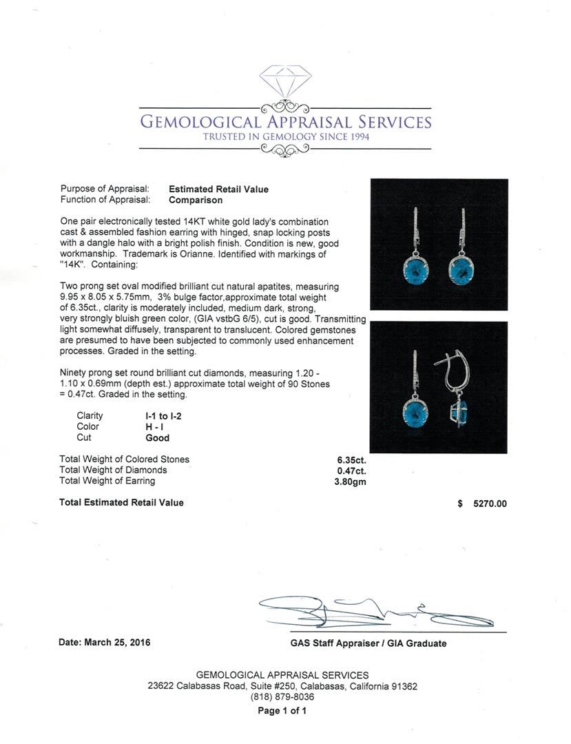 One pair electronically tested 14KT white gold lady's combination cast & assembled fashion earring with hinged, snap locking posts with a dangle halo with a bright polish finish. Trademark is Orianne. Identified with markings of "14K". Condition is new, good workmanship. Containing: Two prong set oval modified brilliant cut natural apatites, measuring 9.95 x 8.05 x 5.75mm, 3%. bulge factor, approximate total weight of 6.35ct., clarity is moderately included, medium dark, strong, very strongly bluish green color, (GIA vstbG 6/5), cut is good. Transmitting light somewhat diffusely, transparent to translucent. Colored gemstones are presumed to have been subjected to commonly used enhancement processes. Graded in the setting. Ninety prong set round brilliant cut diamonds, measuring 1.20 - 1.10 x 0.69mm (depth est.) approximate total weight of 90 Stones = 0.47ct. Graded in the setting. Clarity: I-1 to I-2. Color: H - I. Cut Good. Total Weight of Colored Stones 6.35ct. Total Weight of Diamonds 0.47ct. Total Weight of Earring 3.80gm. GAS Appraised at $5,270.00.