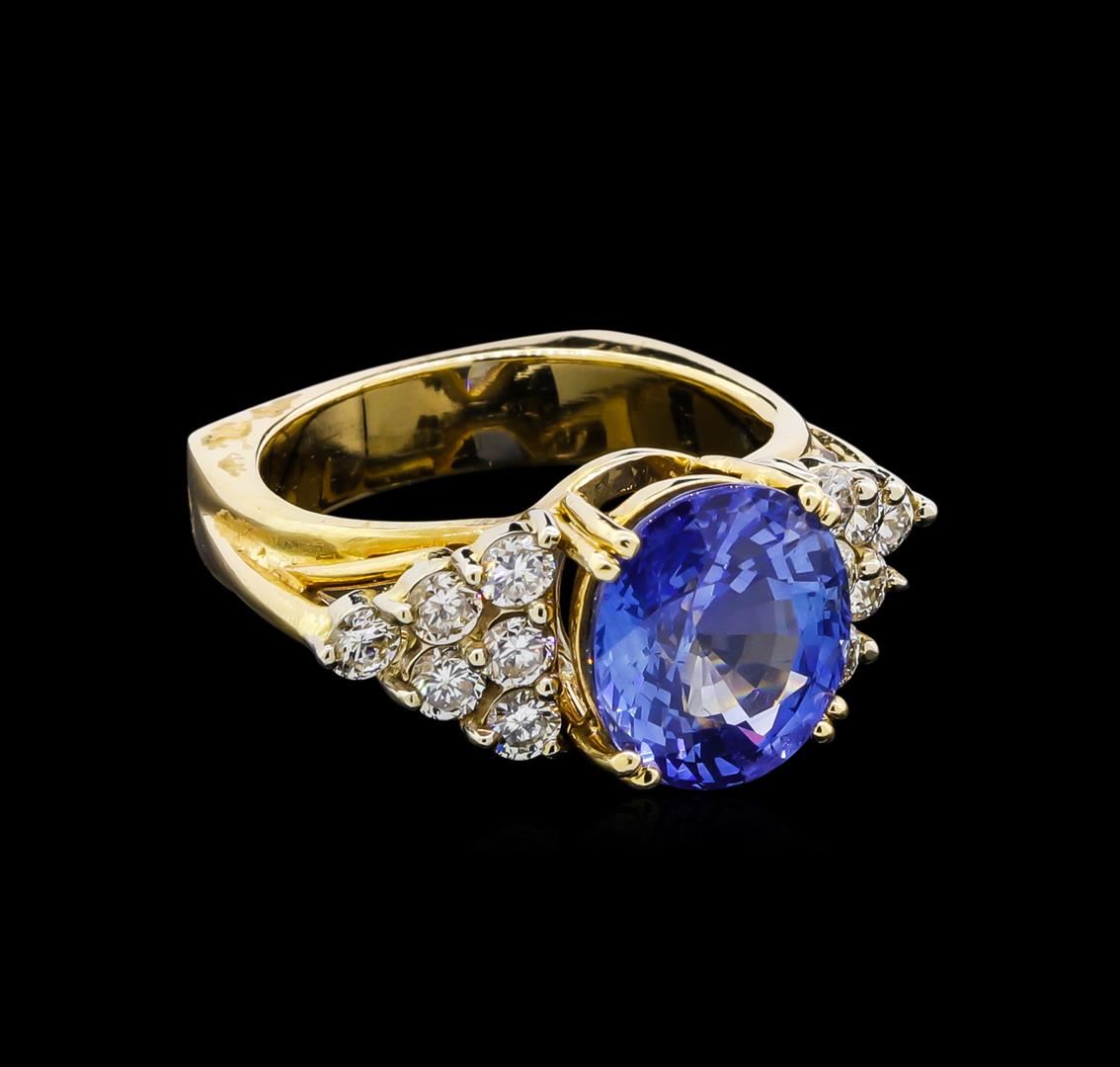 One electronically tested 14KT yellow gold ladies cast tanzanite and diamond ring. The featured tanzanite is set between mirroring diamond galleries supported by grooved shoulders, completed by a four millimeter wide European style band. Bright polish finish with rhodium accents. Identified with markings of "14K". Condition is good. Containing: One prong set oval mixed cut natural tanzanite, measuring 11.40 x 10.20 x 6.75mm, 15%. bulge factor, approximate weight of 6.35ct., clarity is slightly included, type I, medium, very slightly grayish, violetish blue color, (GIA vB 5/3), cut is good. Transmitting light with a minimum of distortion, transparent. Naturally occurring internal & external characteristics are present. Colored Stone Grading Report attached. Graded in the setting. Twelve prong set round brilliant cut diamonds, measuring 2.80 - 2.80 x 1.68mm (depth est.) approximate total weight of 12 Stones = 1.01ct. Graded in the setting. Clarity: VS-2 to SI-1. Color: G - I. Total Weight of Colored Stones 6.35ct. Total Weight of Diamonds 1.01ct. Total Weight of Ring 10.89gm. AIG Appraised at $17,200.00.