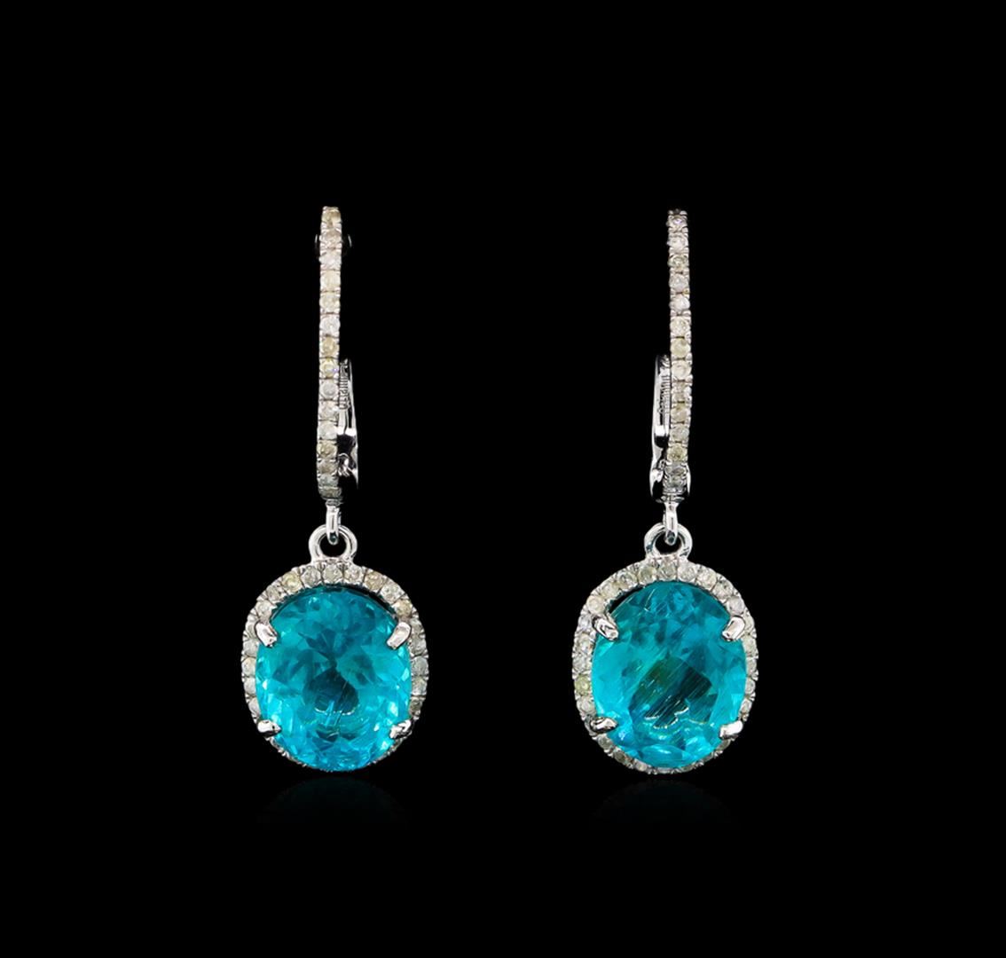 One pair electronically tested 14KT white gold lady's combination cast & assembled fashion earring with hinged, snap locking posts with a dangle halo with a bright polish finish. Trademark is Orianne. Identified with markings of "14K". Condition is new, good workmanship. Containing: Two prong set oval modified brilliant cut natural apatites, measuring 9.95 x 8.05 x 5.75mm, 3%. bulge factor, approximate total weight of 6.35ct., clarity is moderately included, medium dark, strong, very strongly bluish green color, (GIA vstbG 6/5), cut is good. Transmitting light somewhat diffusely, transparent to translucent. Colored gemstones are presumed to have been subjected to commonly used enhancement processes. Graded in the setting. Ninety prong set round brilliant cut diamonds, measuring 1.20 - 1.10 x 0.69mm (depth est.) approximate total weight of 90 Stones = 0.47ct. Graded in the setting. Clarity: I-1 to I-2. Color: H - I. Cut Good. Total Weight of Colored Stones 6.35ct. Total Weight of Diamonds 0.47ct. Total Weight of Earring 3.80gm. GAS Appraised at $5,270.00.