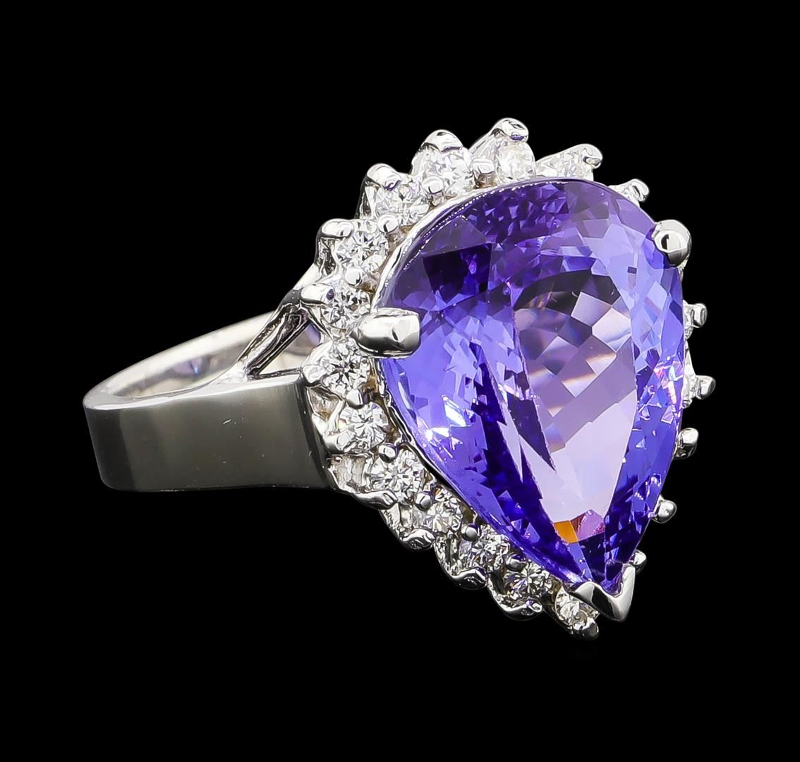 One electronically tested 14KT white gold lady's cast fashion ring with a basket halo with a bright polish finish. The featured lady's ring has a shank measuring 3.04 millimeters wide. Identified with markings of '14K'. Condition is new, good workmanship. Containing: One prong set pear modified brilliant cut natural tanzanite, measuring 13.93 x 10.70 x 6.59mm, (depth est.) approximate weight of 6.36ct., clarity is eye clean, medium, moderately strong, bluish violet color, (GIA bV 5/4), cut is very good. Transmitting light with no distortion, transparent. Colored gemstones are presumed to have been subjected to commonly used enhancement processes. Graded in the setting. Twenty prong set round brilliant cut diamonds, measuring 1.85 - 1.75 x 1.12mm (depth est.) approximate total weight of 20 Stones = 0.45ct. Graded in the setting. Clarity SI-1 to I-1. Color: H - I Cut Good. Total Weight of Colored Stones 6.36ct.. Total Weight of Diamonds 0.45ct.. Total Weight of Ring 7.40gm. GAS Appraised at $10,210.00.